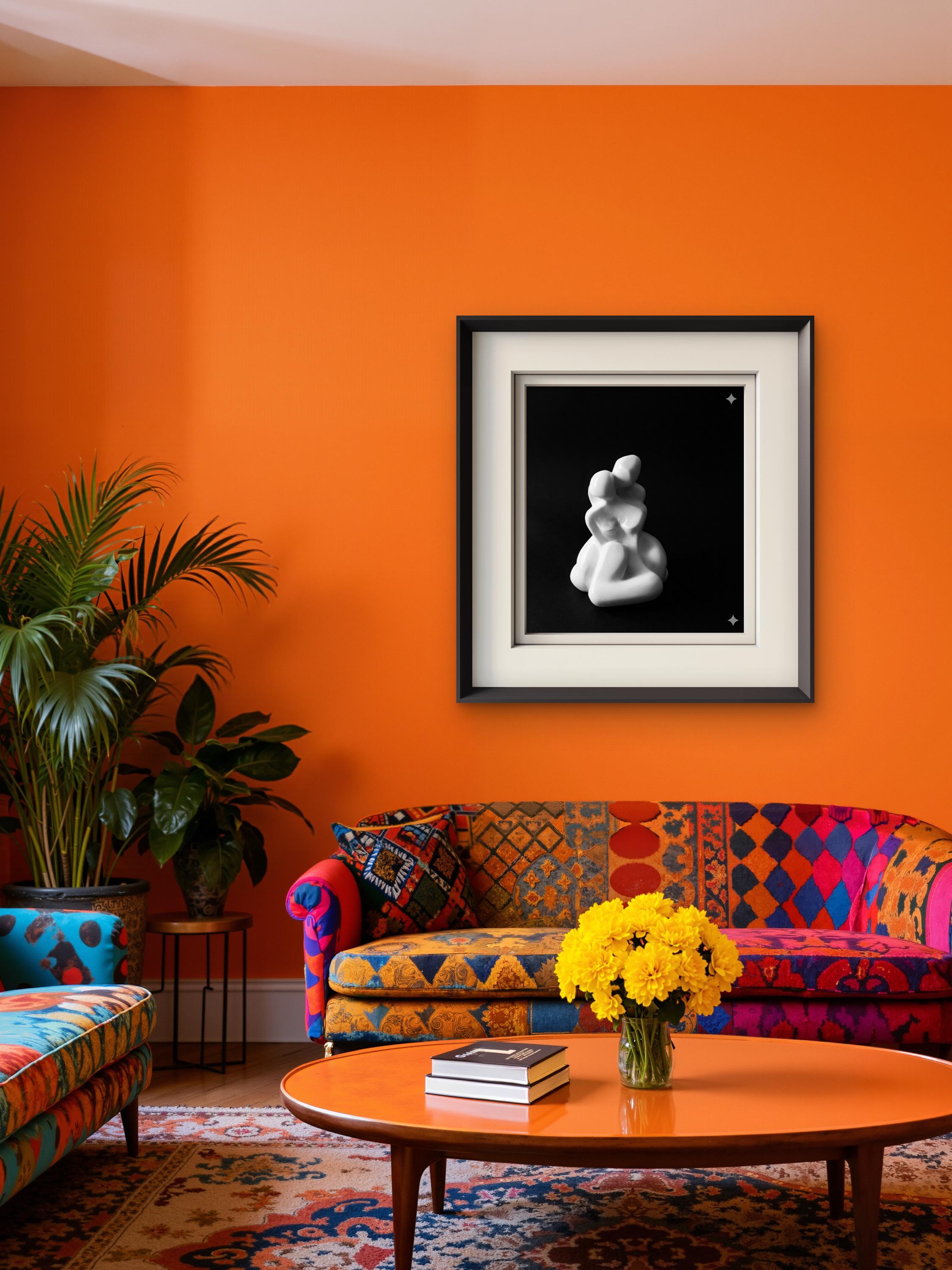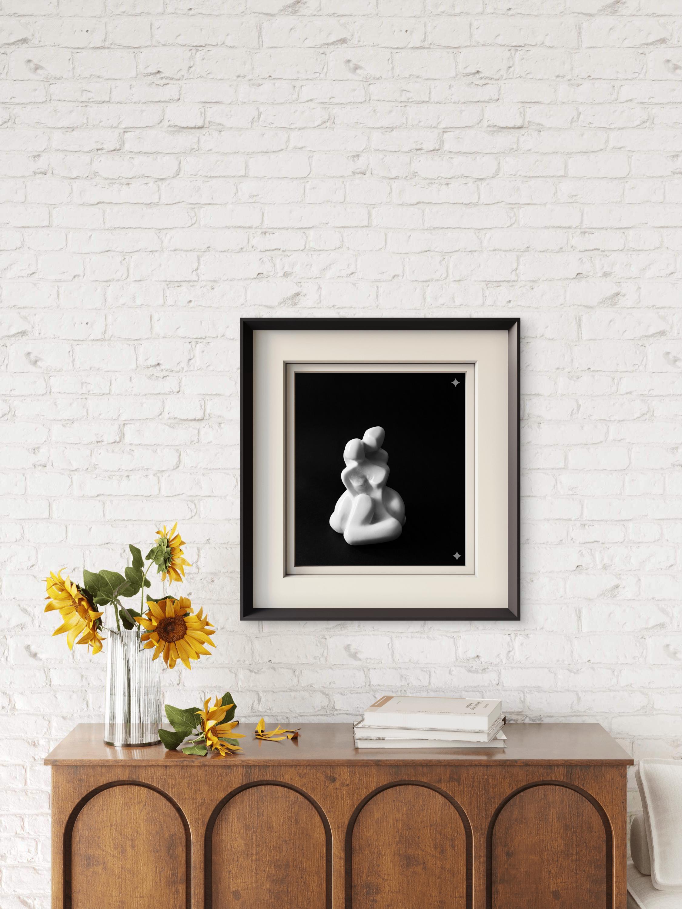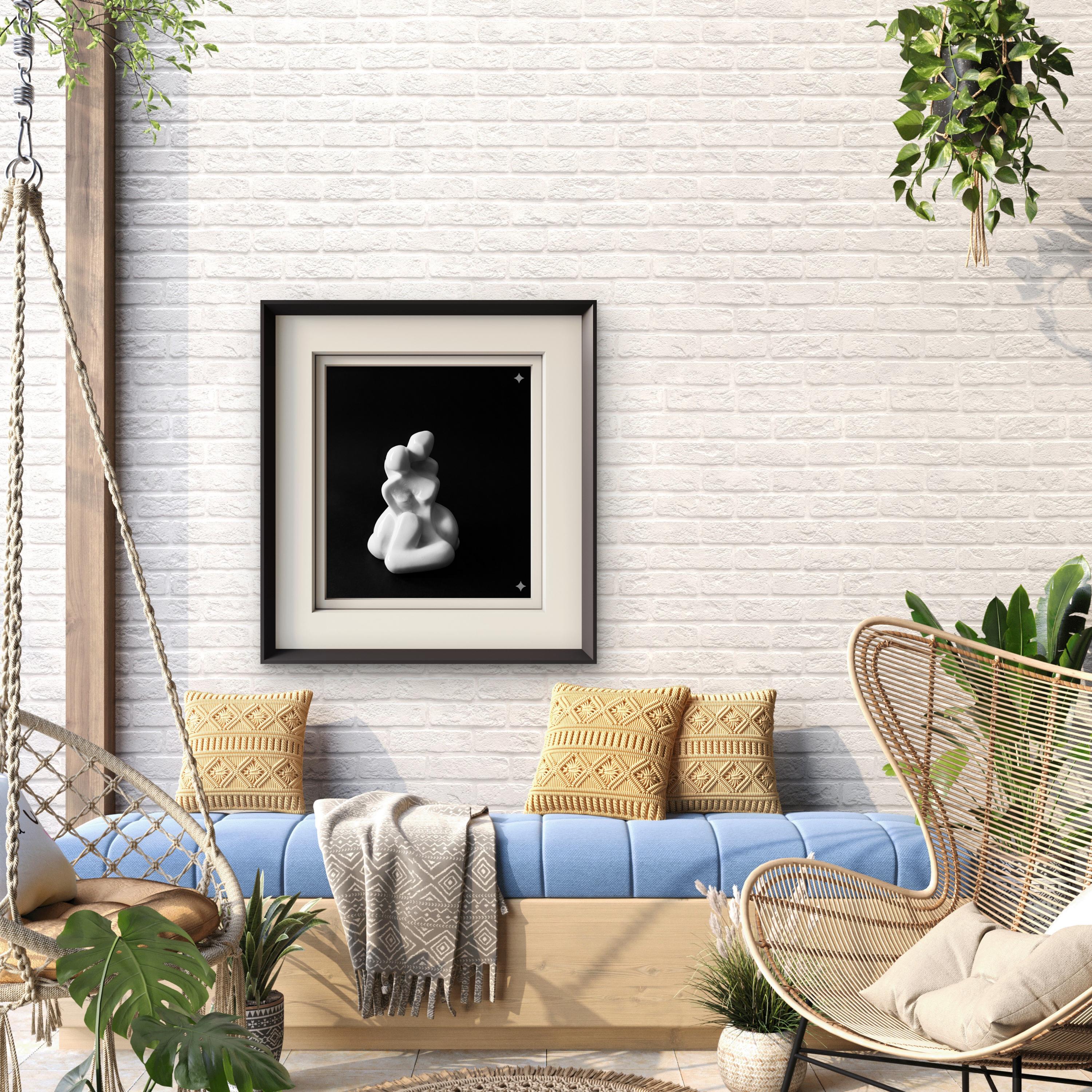This fine art photograph features an original, hand-sculpted white concrete sculpture, beautifully captured against a deep black background. The striking contrast highlights the fluid lines and tactile texture of the piece, representing an eternal embrace and the beauty of togetherness.