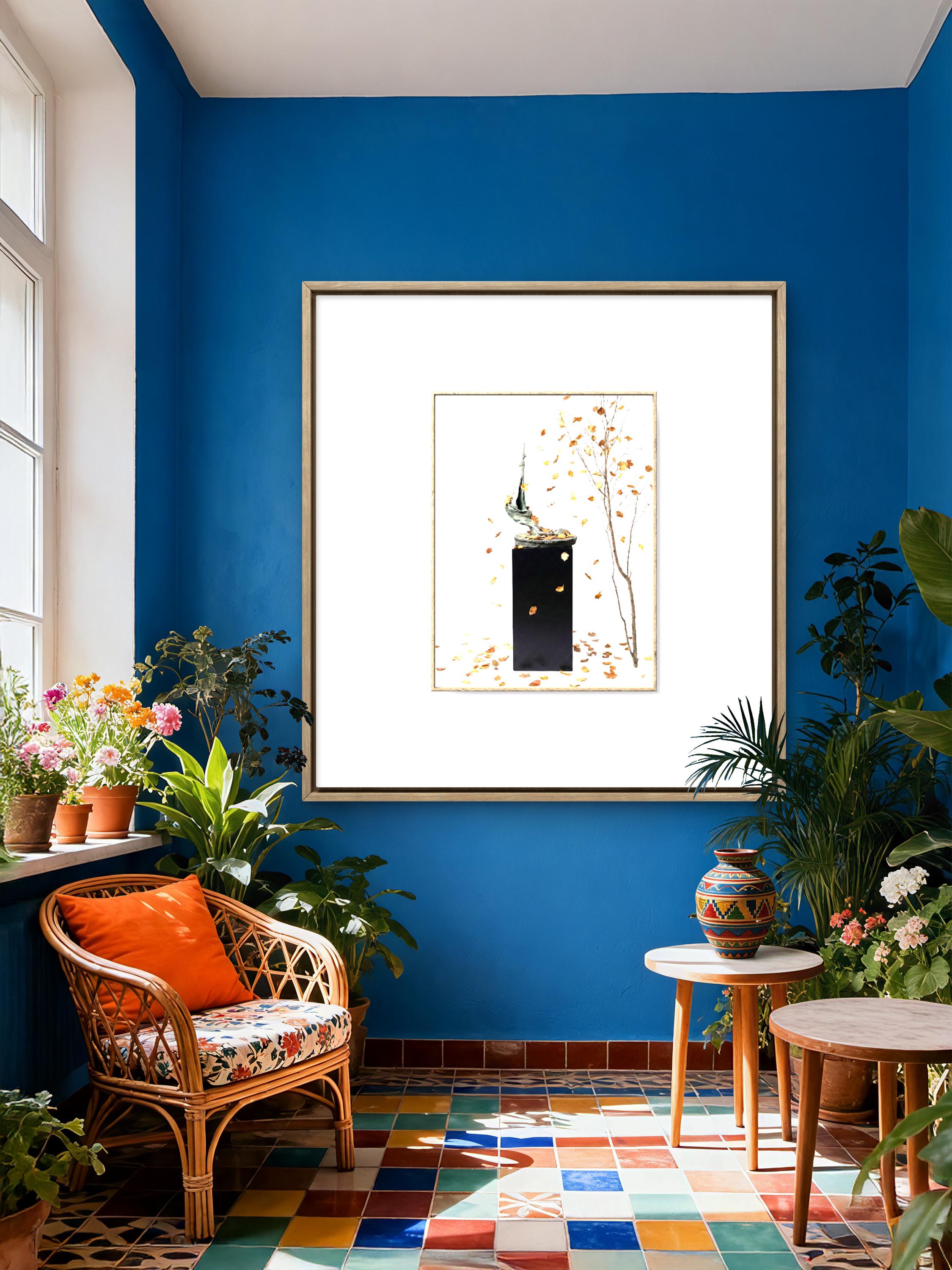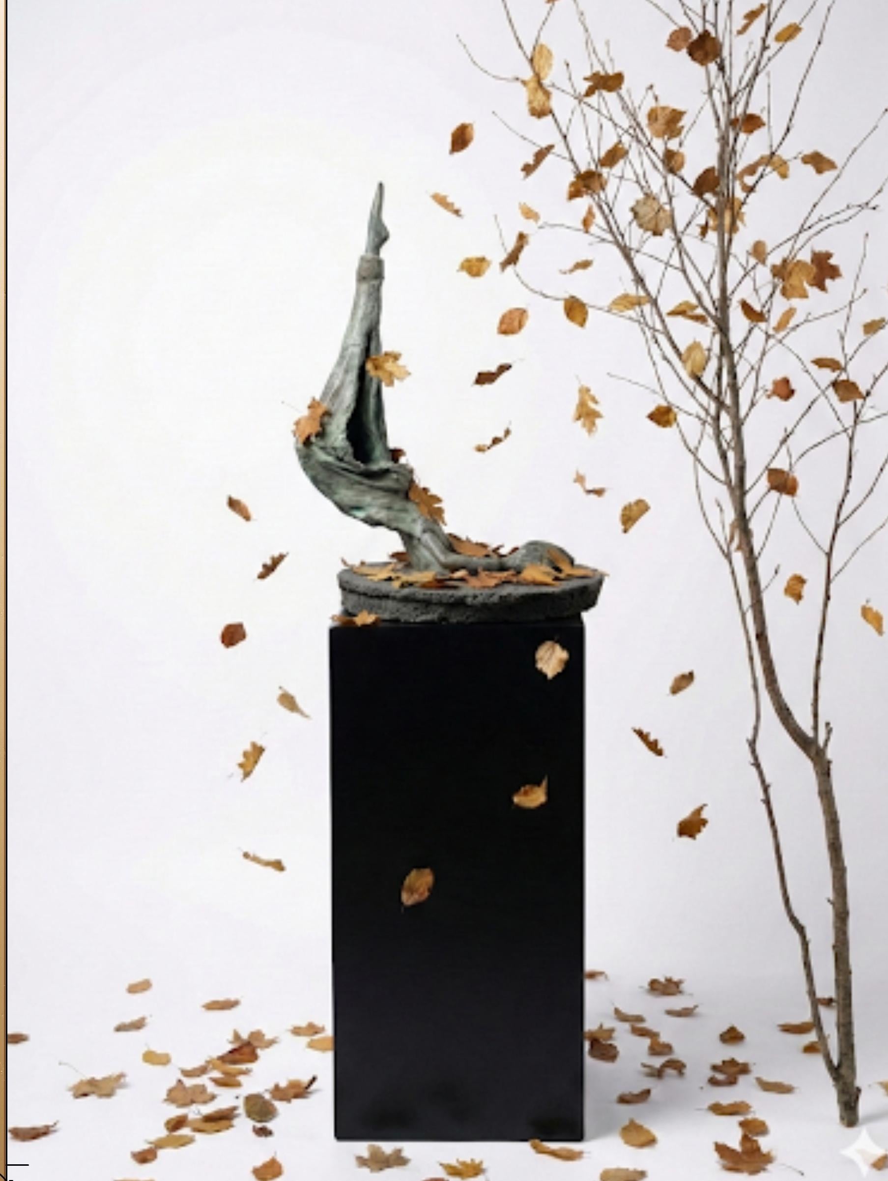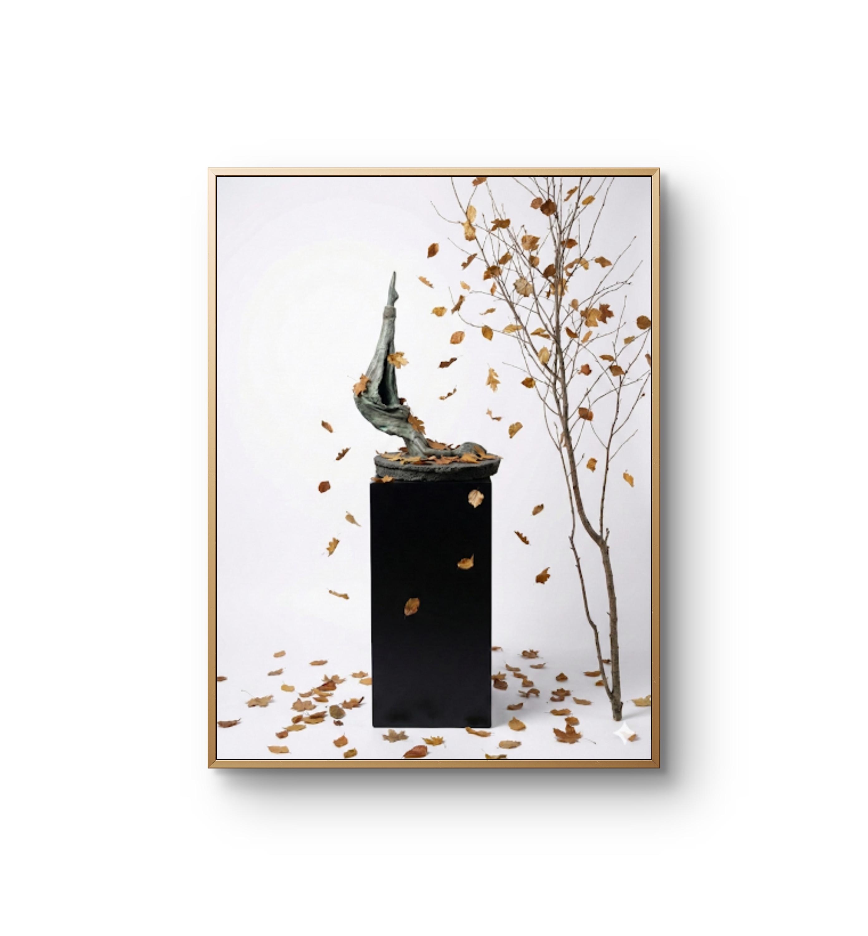 This print Capture the ephemeral beauty of change with this exquisite, handcrafted abstract sculpture. This piece features a fluid, organic form—reminiscent of a graceful limb or a weathered branch—rising from a textured base. Set against a minimalist black pedestal, the sculpture is surrounded by the delicate dance of falling autumn leaves, creating a "frozen in time" moment that brings a sense of serenity and contemplation to any space.