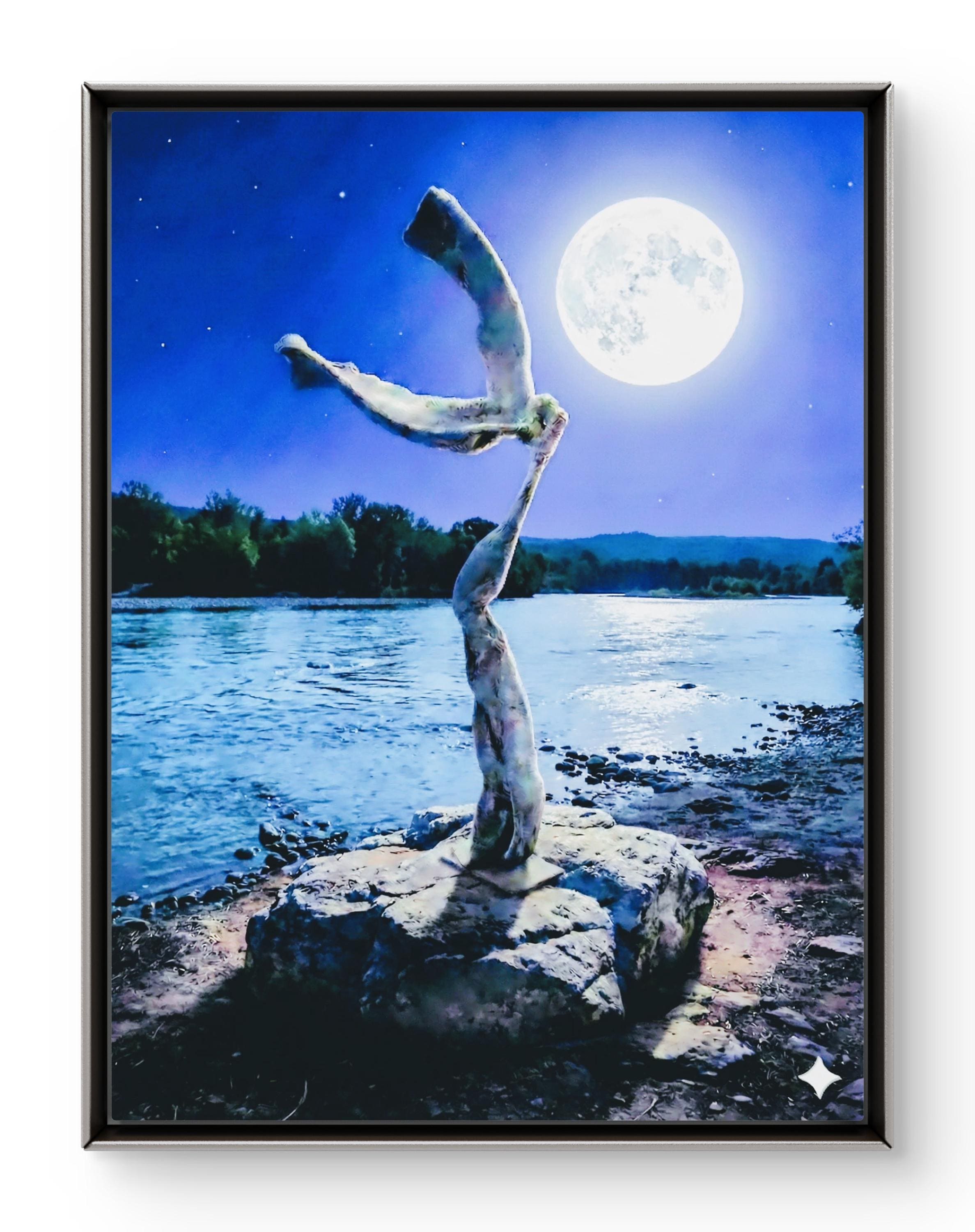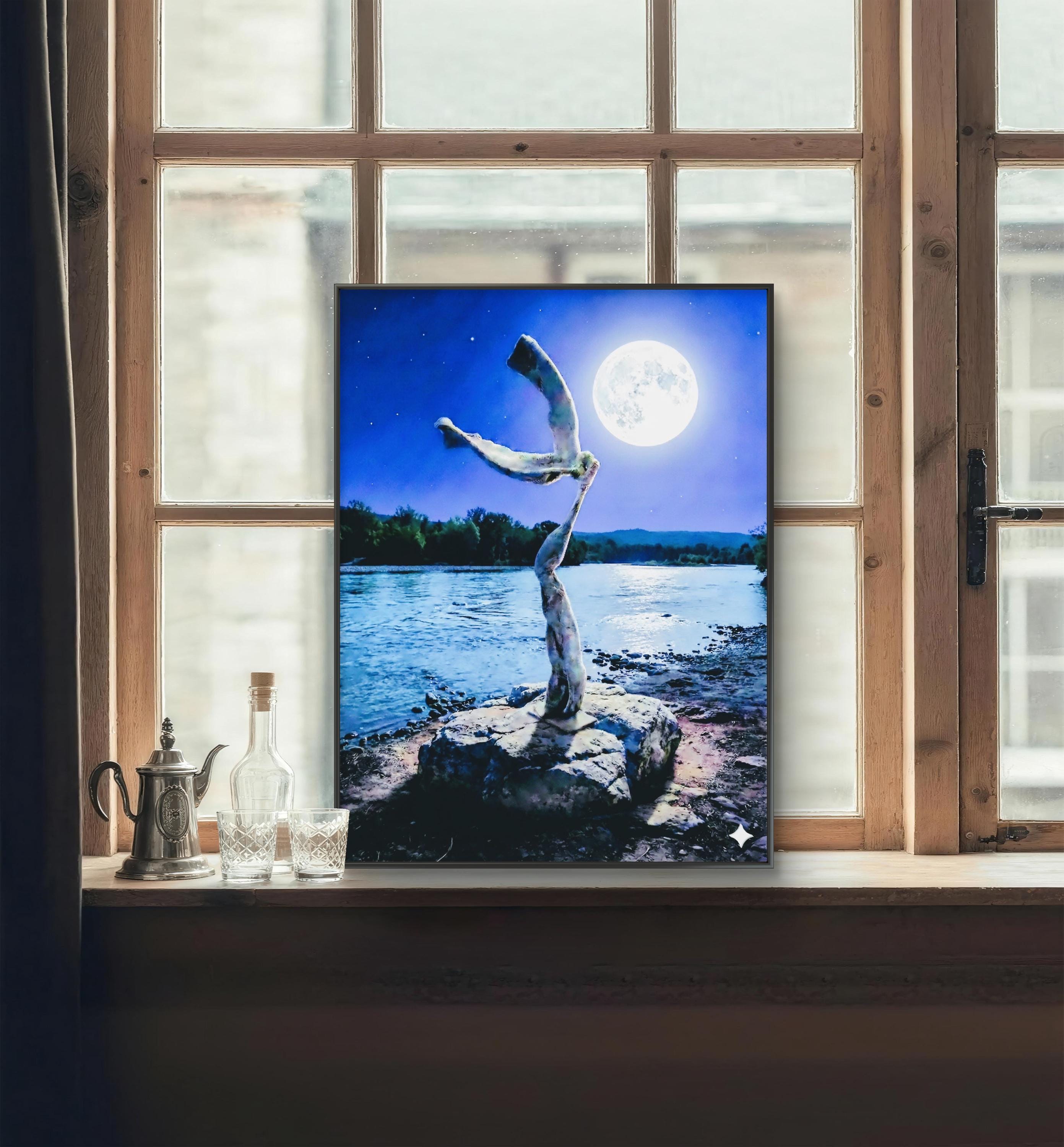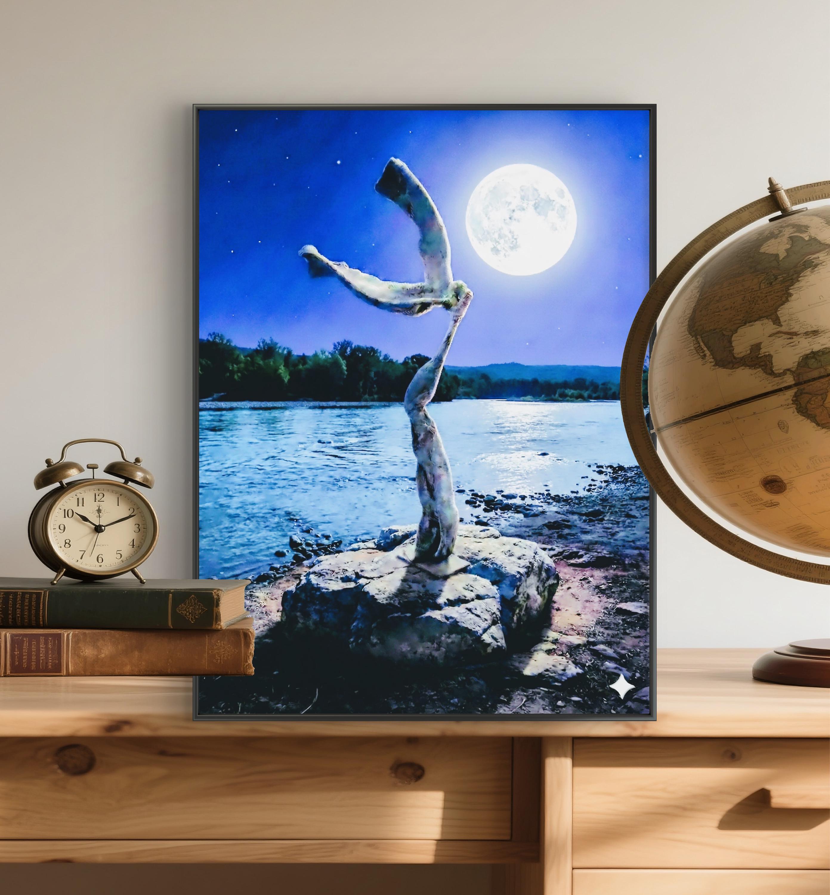 This is a striking, surreal image that would make for a compelling Etsy listing, sold as a physical sculpture, a fine art print. Capture the magic of a mystical night with this breathtaking scene featuring a gravity-defying sculpture of two acrobats. Set against the backdrop of a shimmering river and an oversized, glowing full moon, this piece blends the strength of human form with the serenity of nature. It’s a perfect centerpiece for those who love surrealism, celestial decor, and modern art.