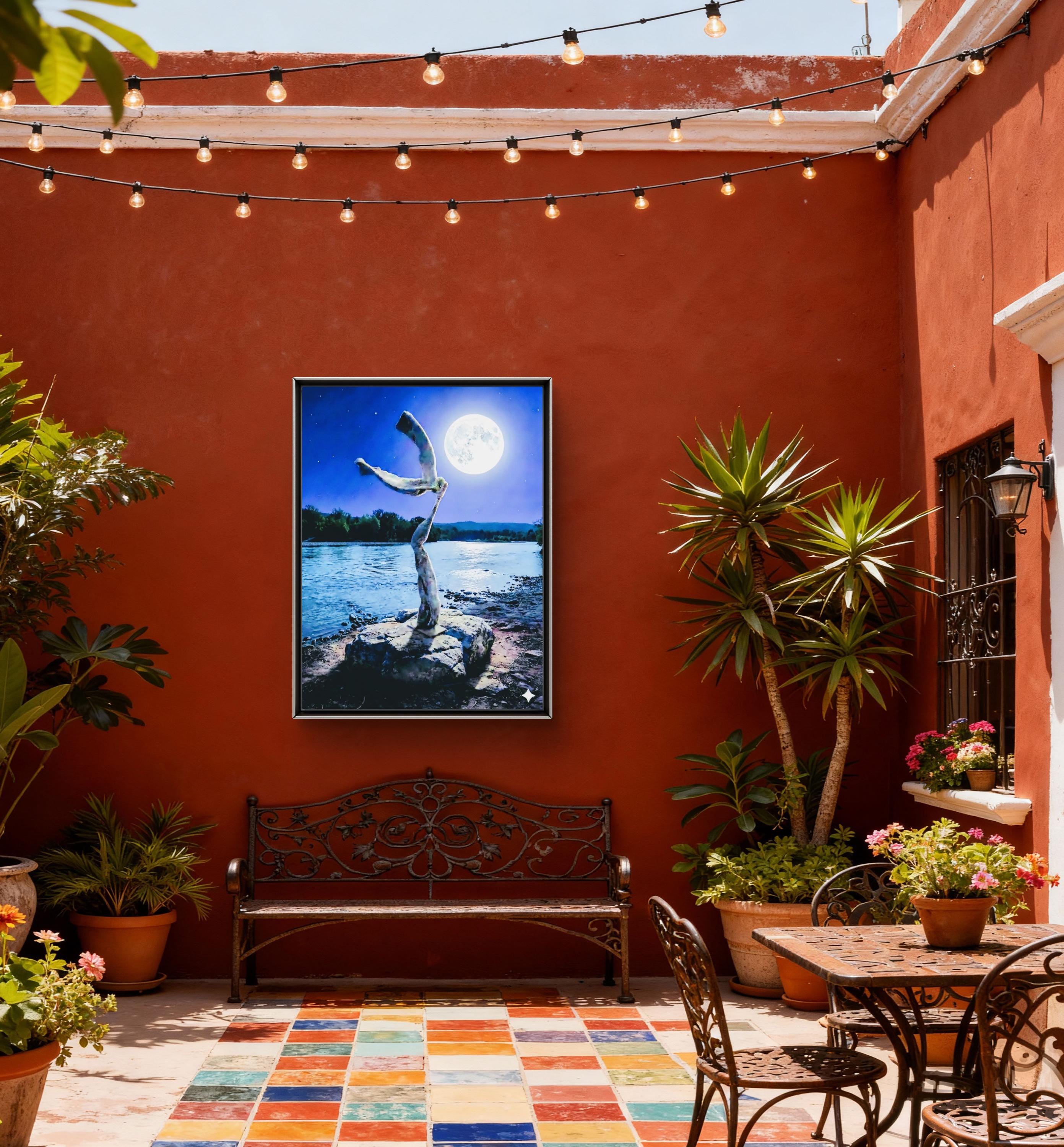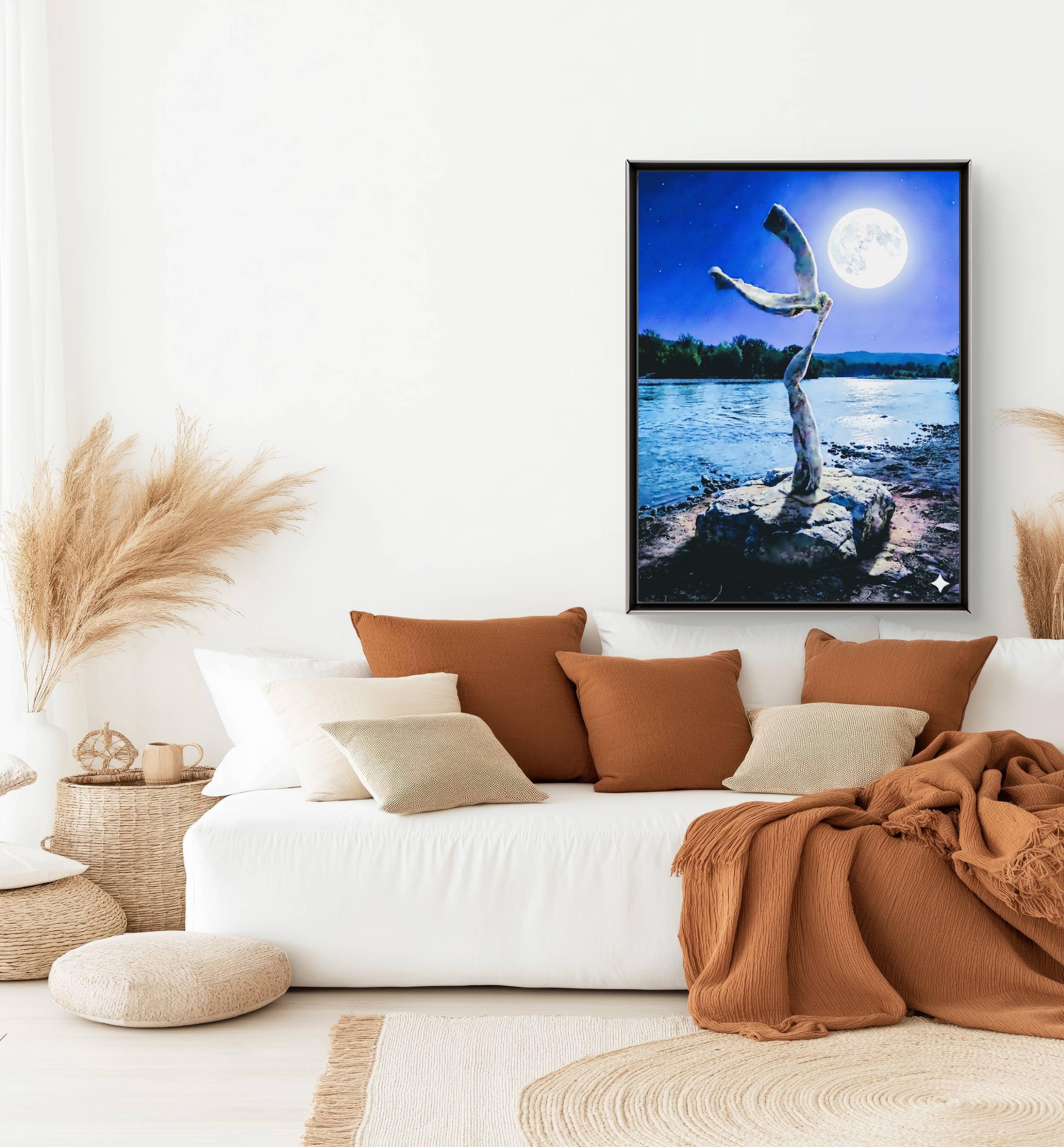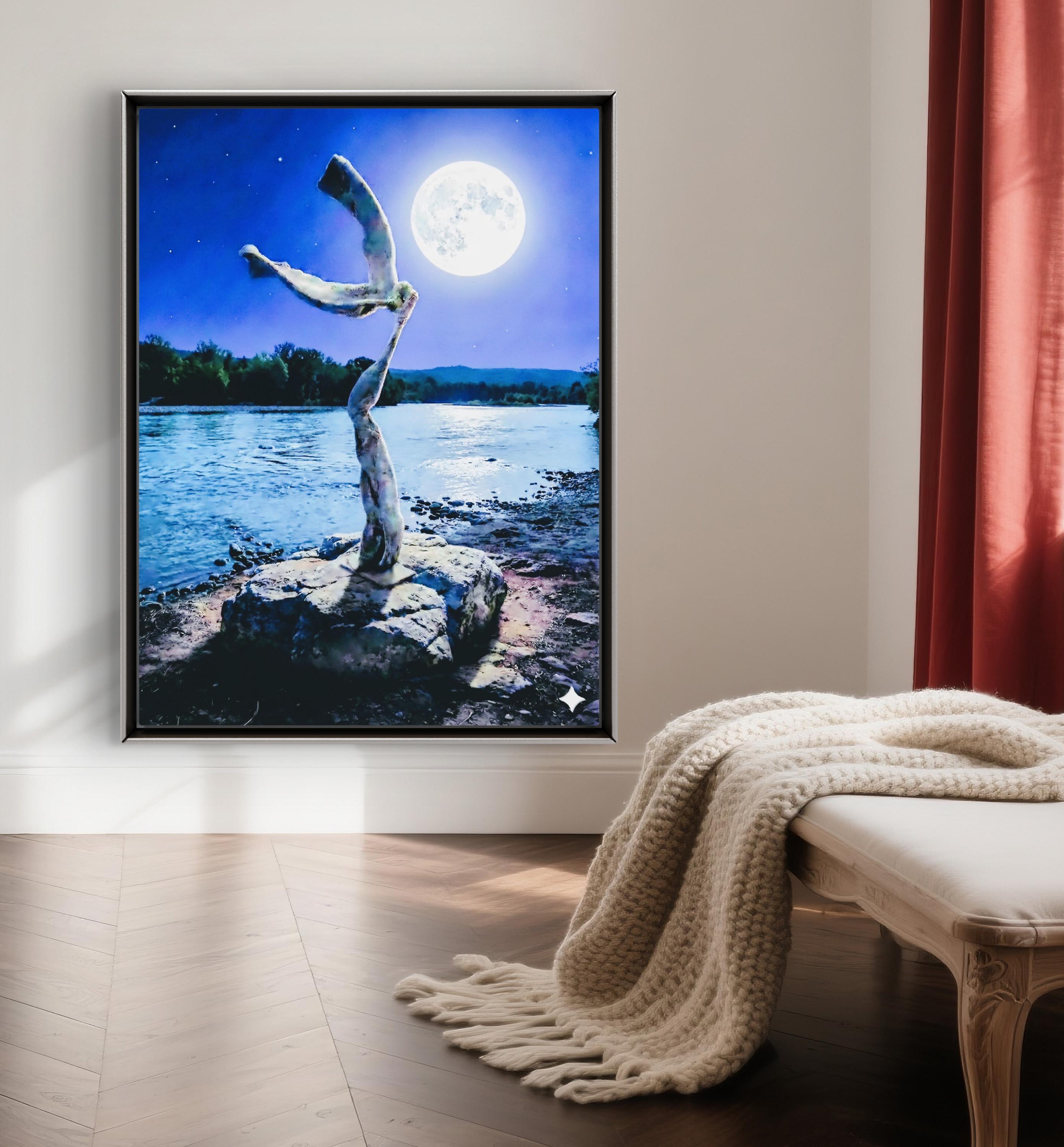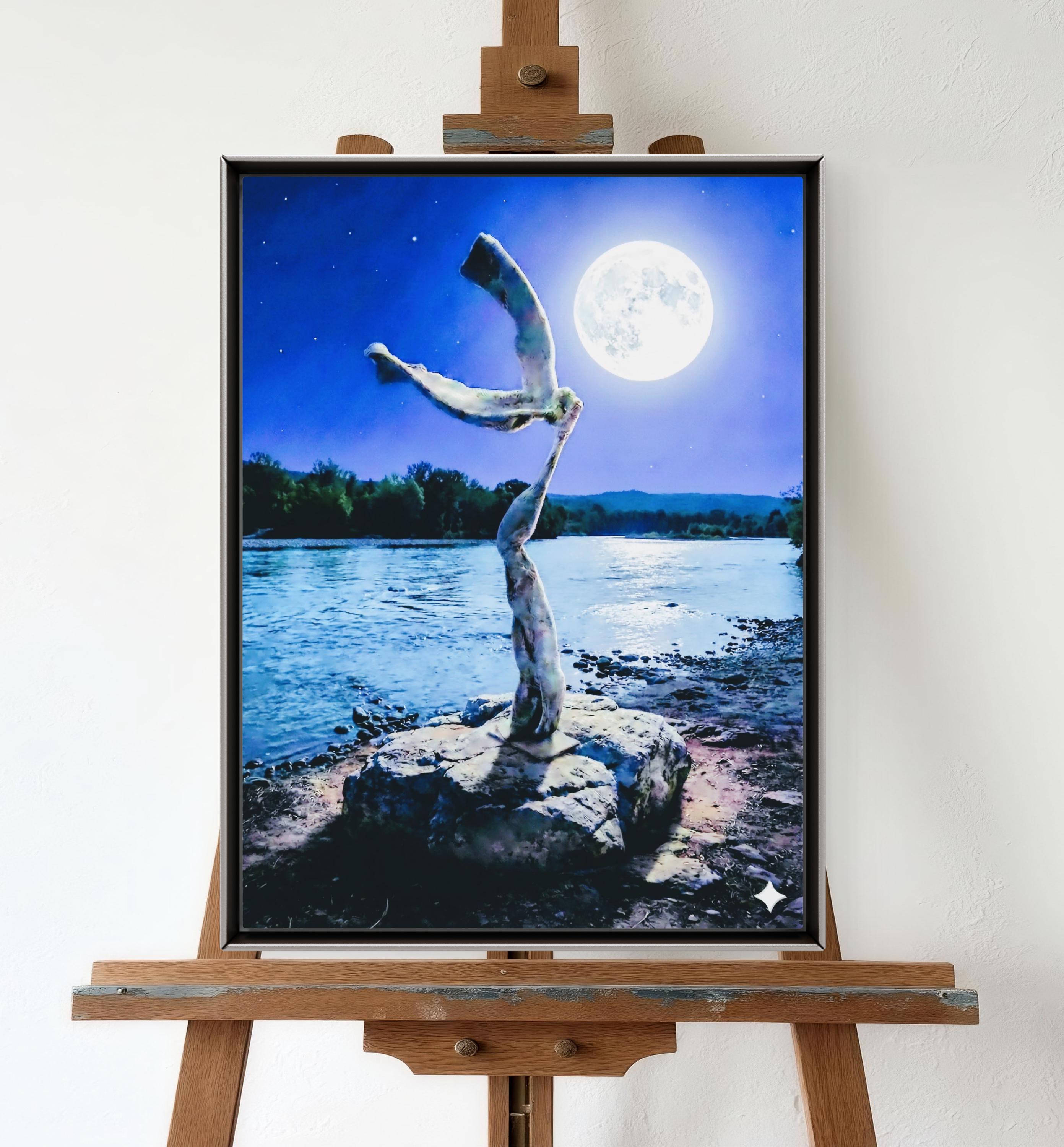 This is a striking, surreal image that would make for a compelling Etsy listing, sold as a physical sculpture, a fine art print. Capture the magic of a mystical night with this breathtaking scene featuring a gravity-defying sculpture of two acrobats. Set against the backdrop of a shimmering river and an oversized, glowing full moon, this piece blends the strength of human form with the serenity of nature. It’s a perfect centerpiece for those who love surrealism, celestial decor, and modern art.