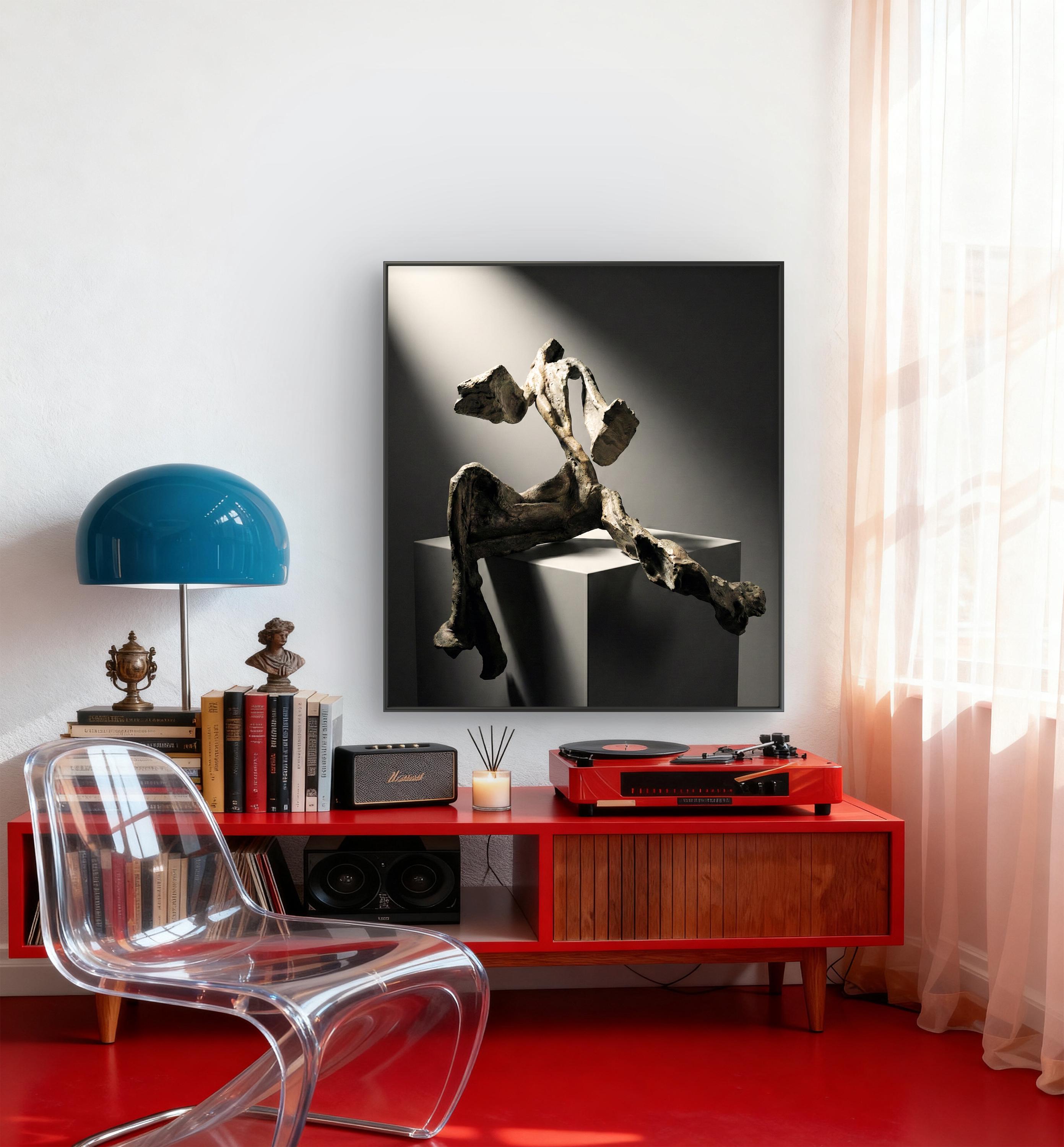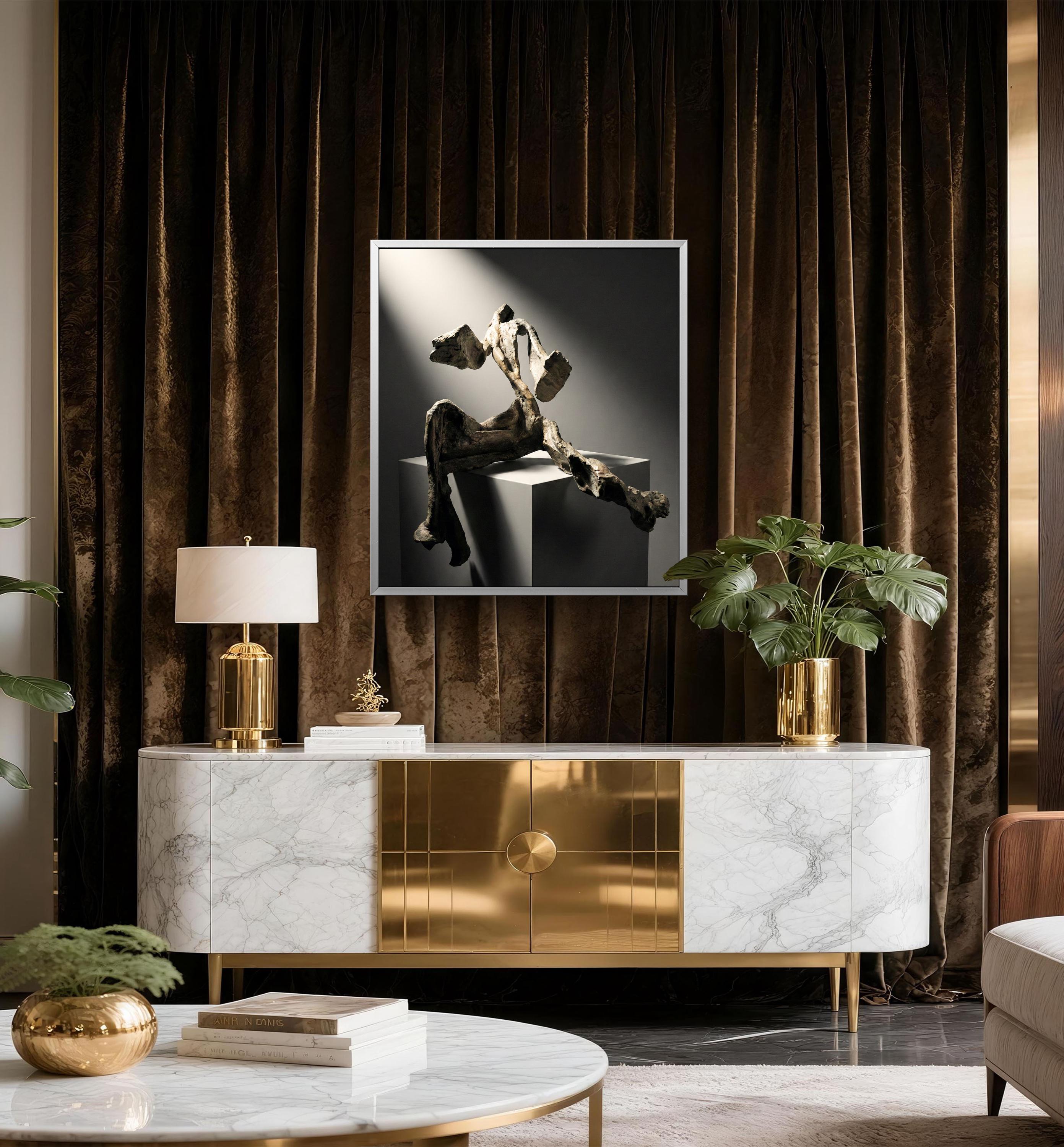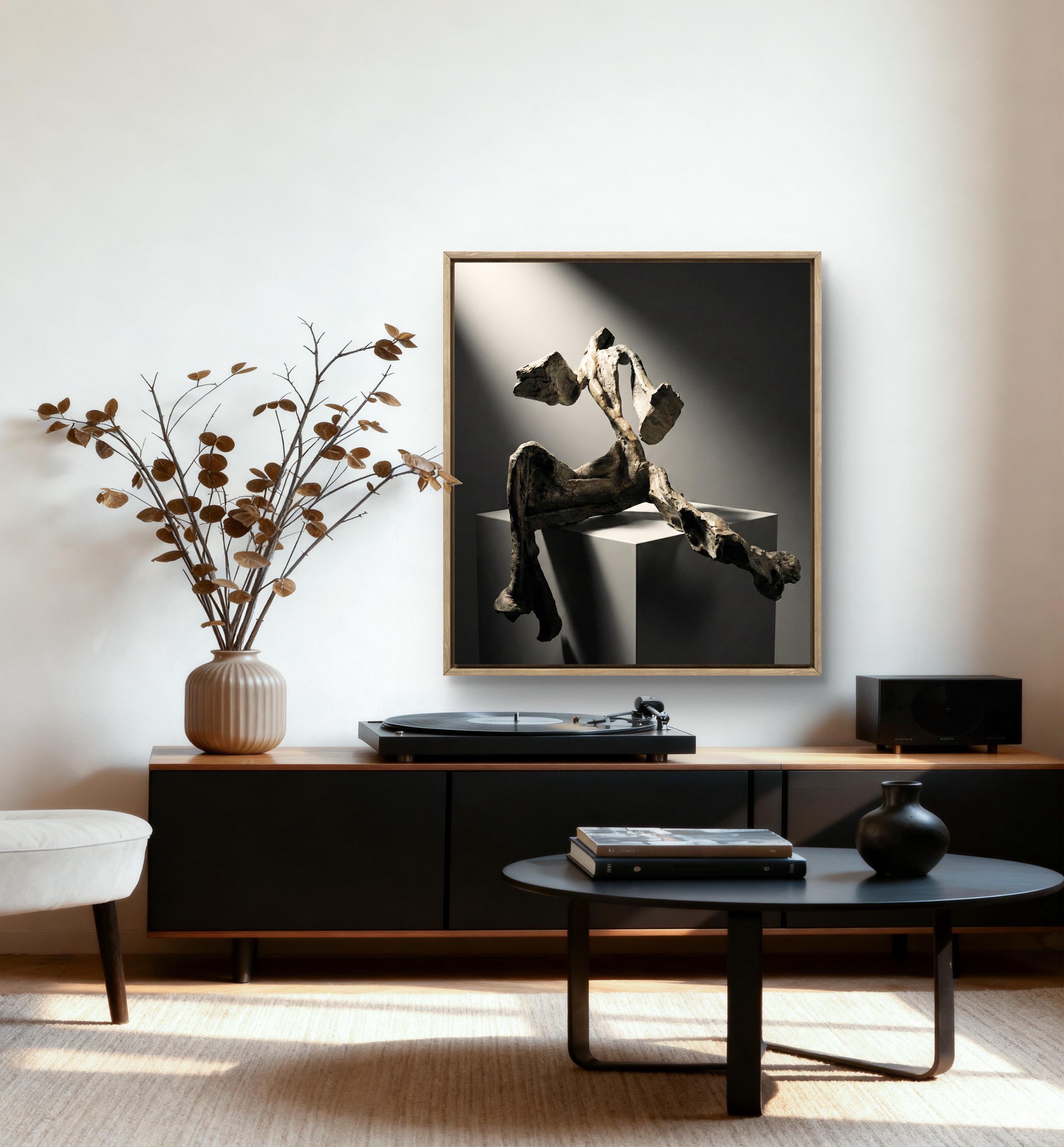 This isn't just a print; it's a conversation starter. The fluid lines of the sculpture combined with the stark lighting create a sense of movement and depth that draws the eye and grounds the room's energy.