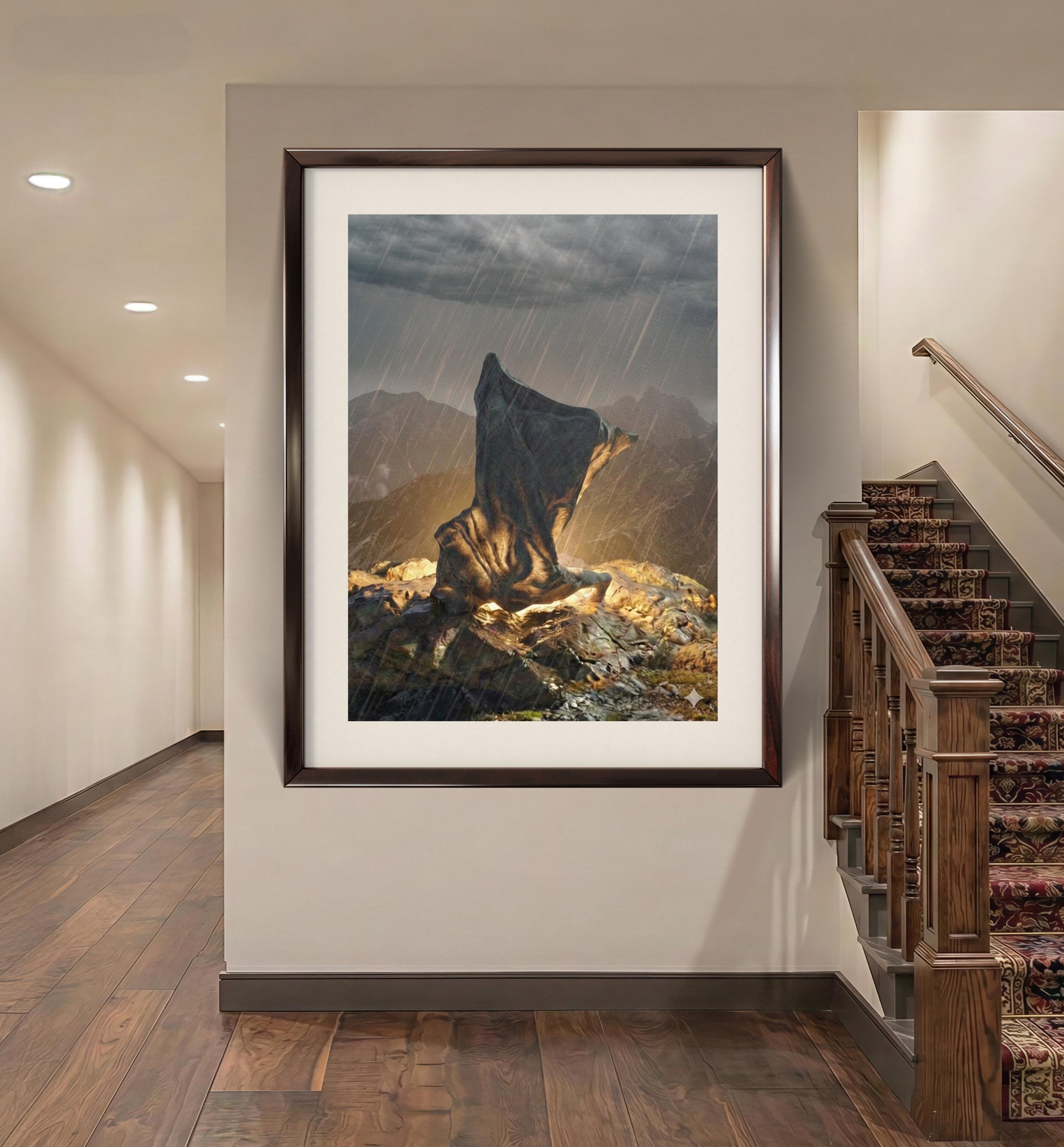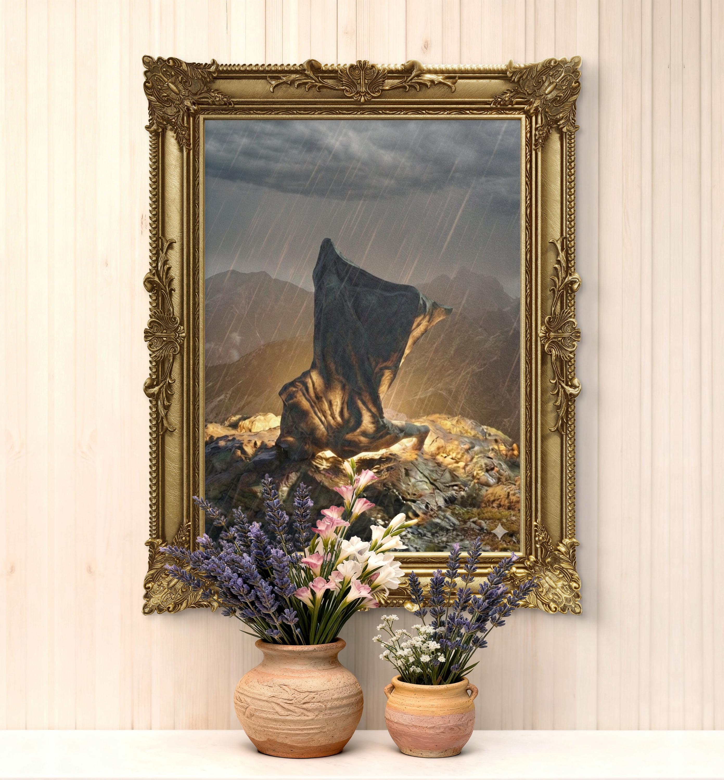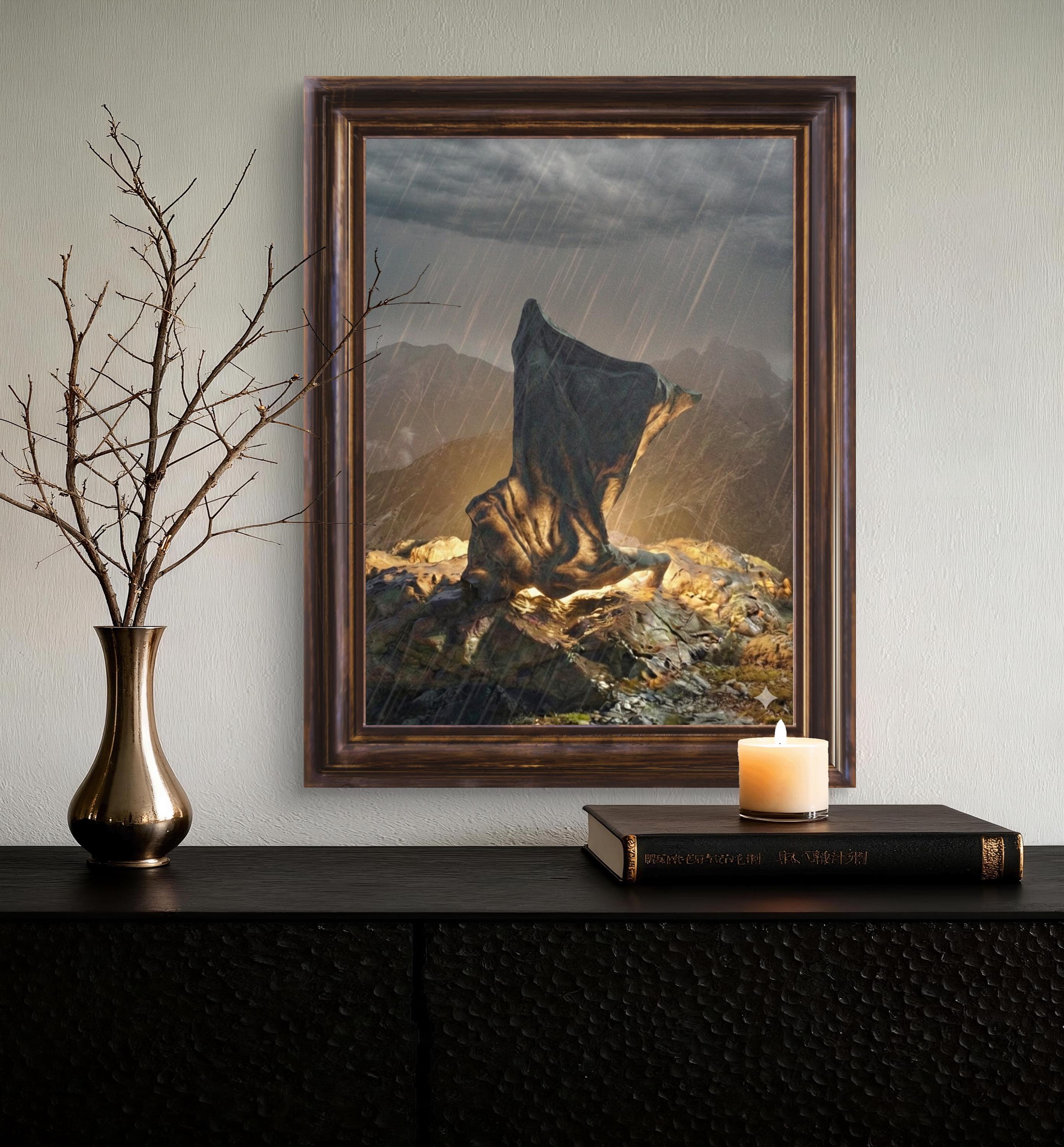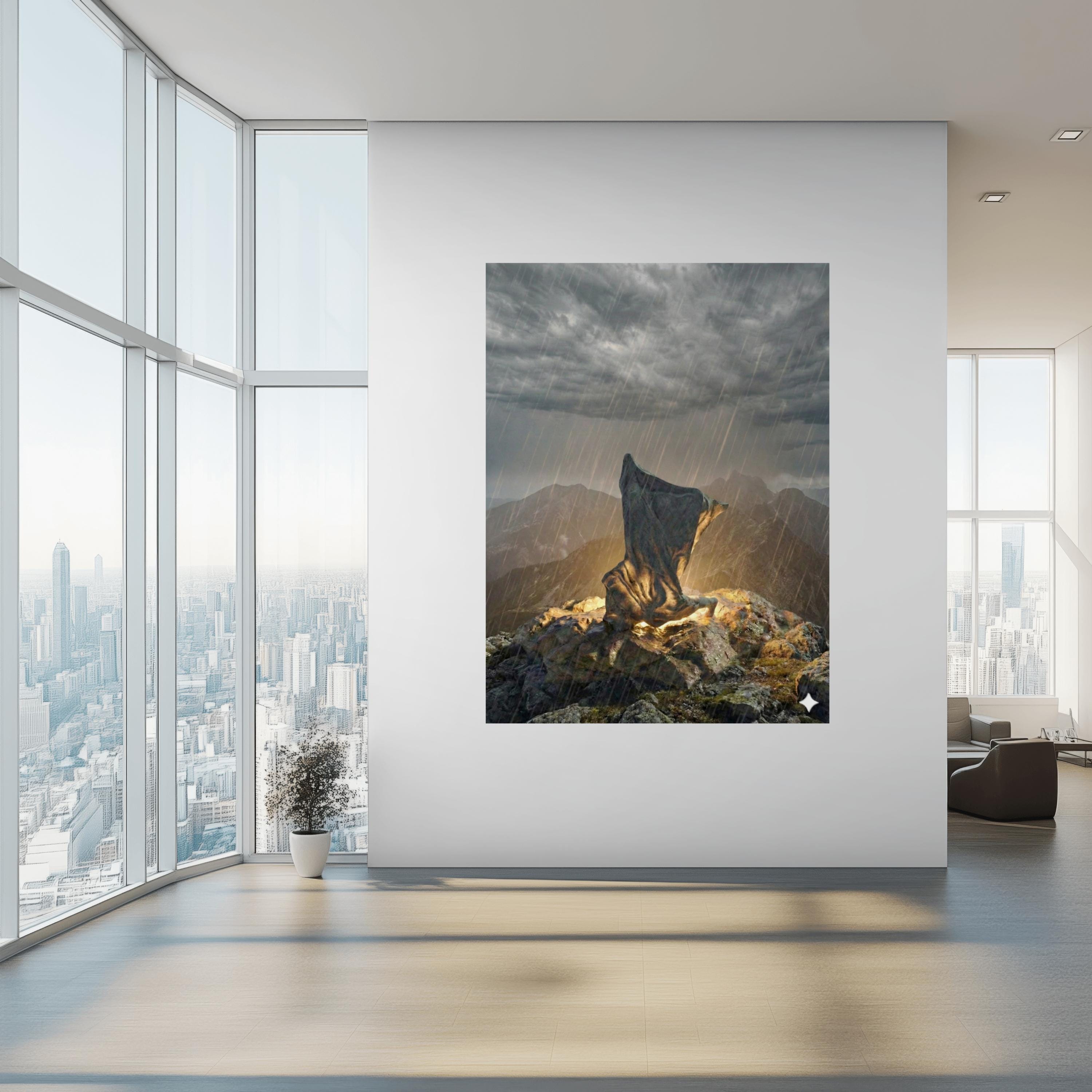 Set against a breathtaking, cinematic backdrop of a mountain range during a fierce storm, the sculpture stands atop a jagged cliff. While the rain falls and dark clouds gather, a warm, golden light emanates from within the bronze folds of the figure’s "garments," symbolizing the unshakable light of prayer and hope that burns even in the darkest times.