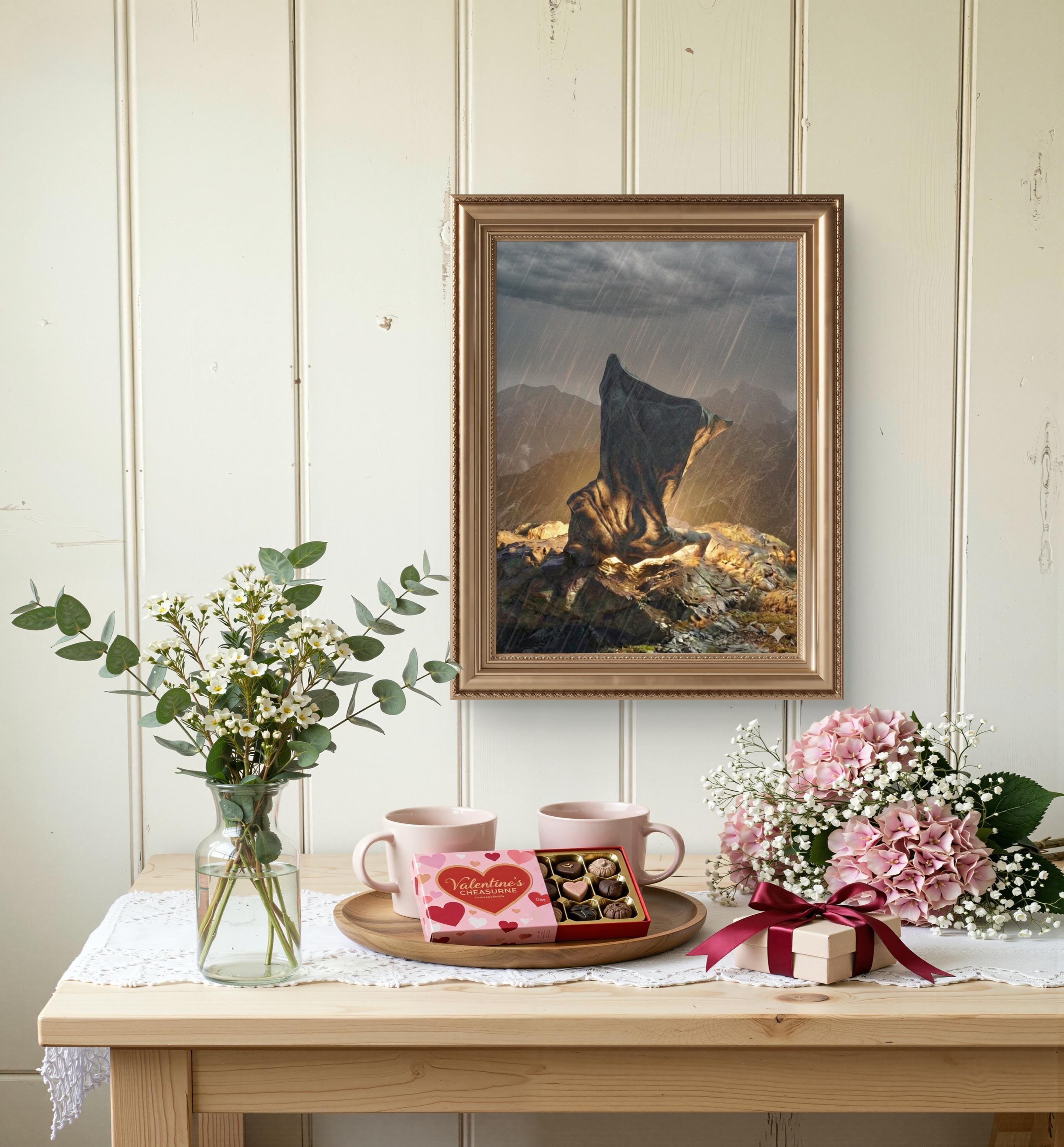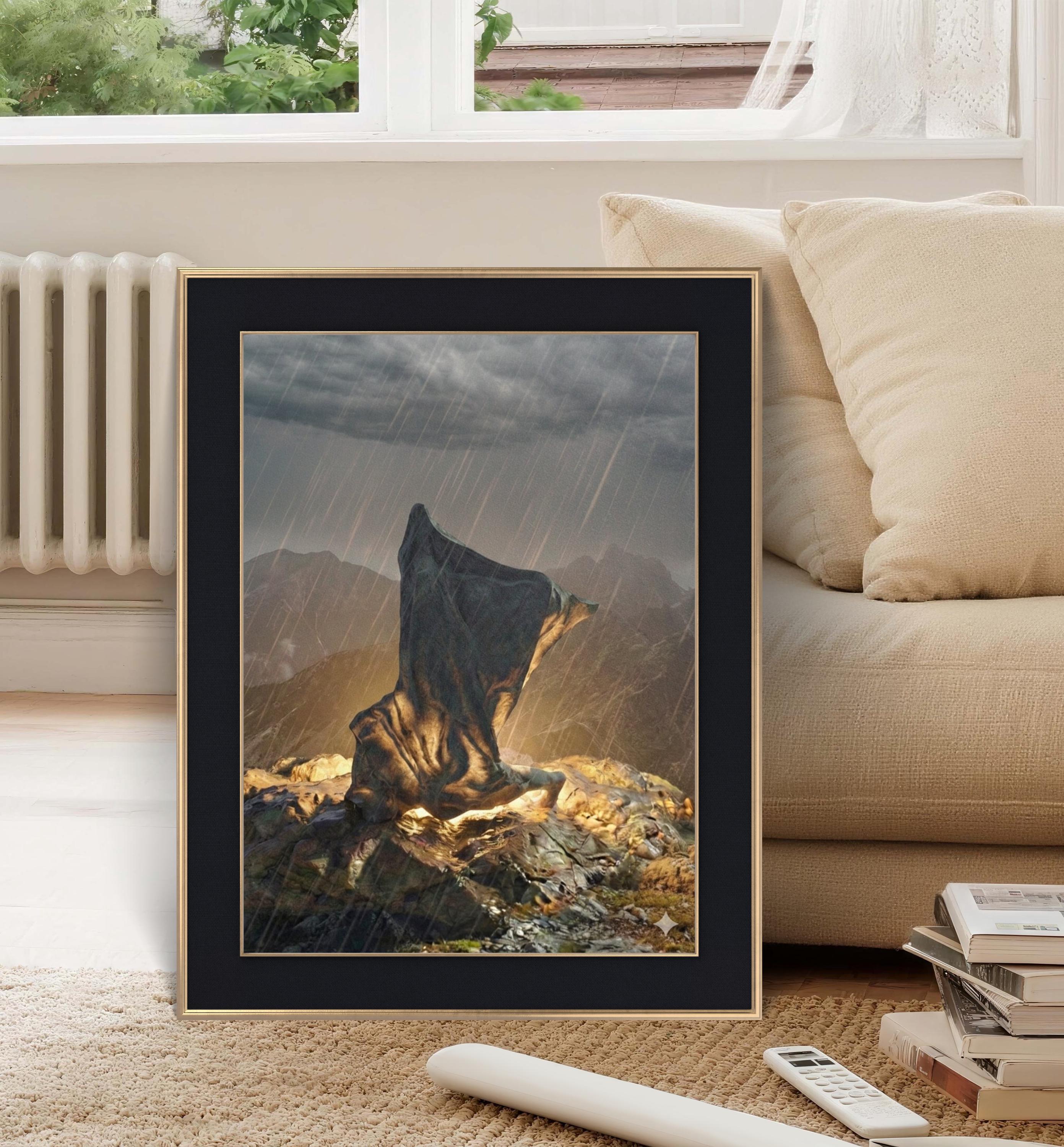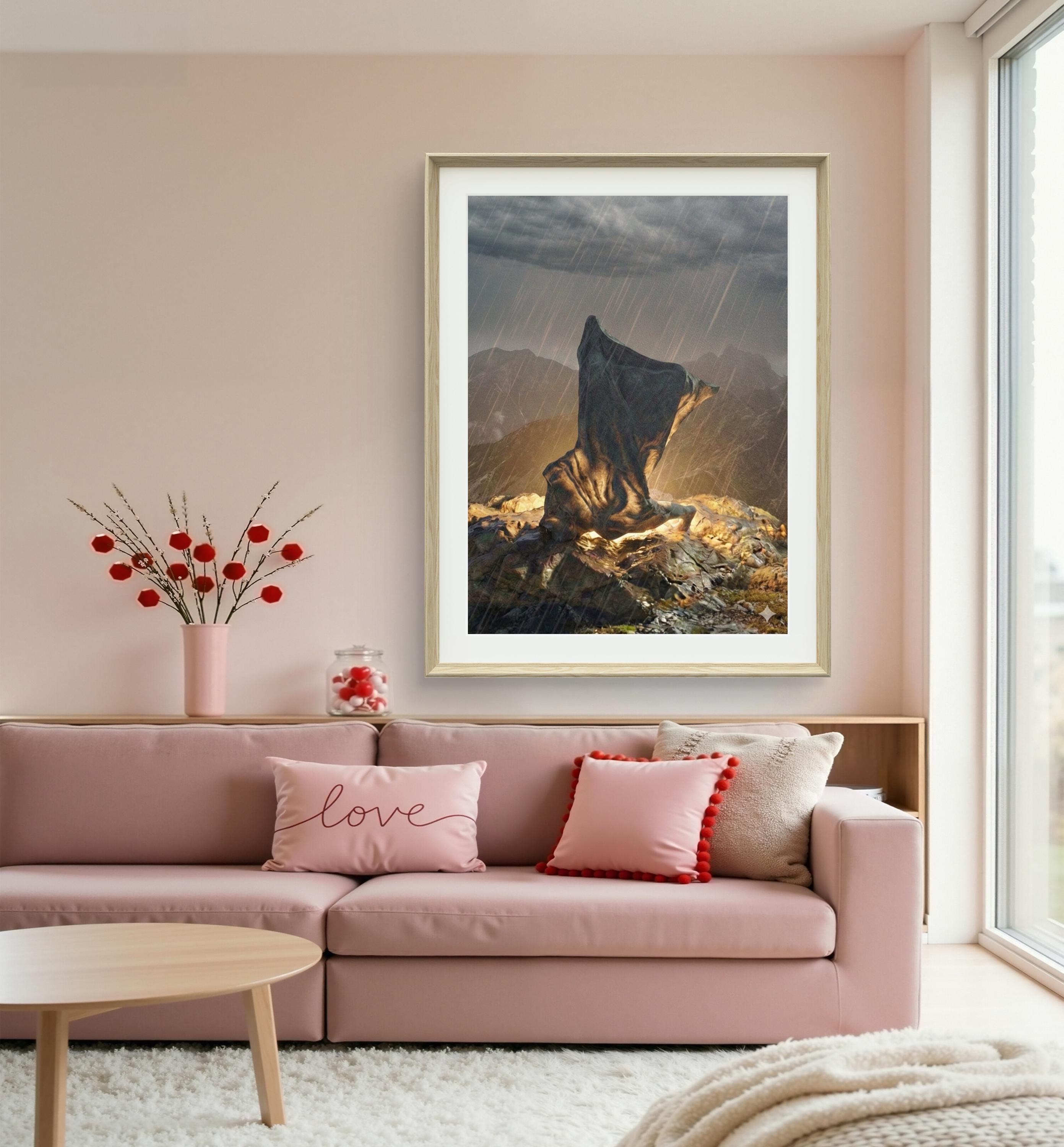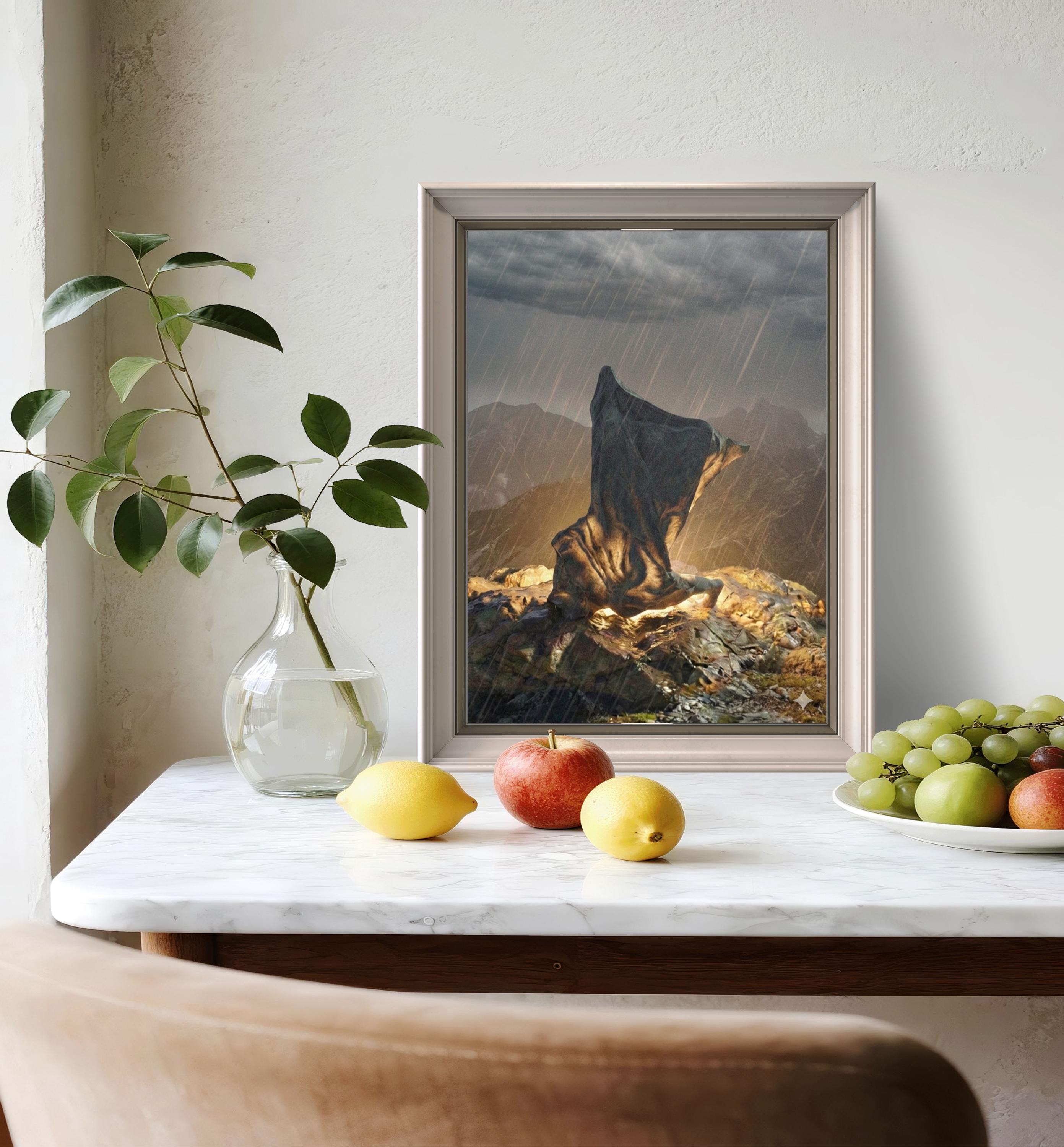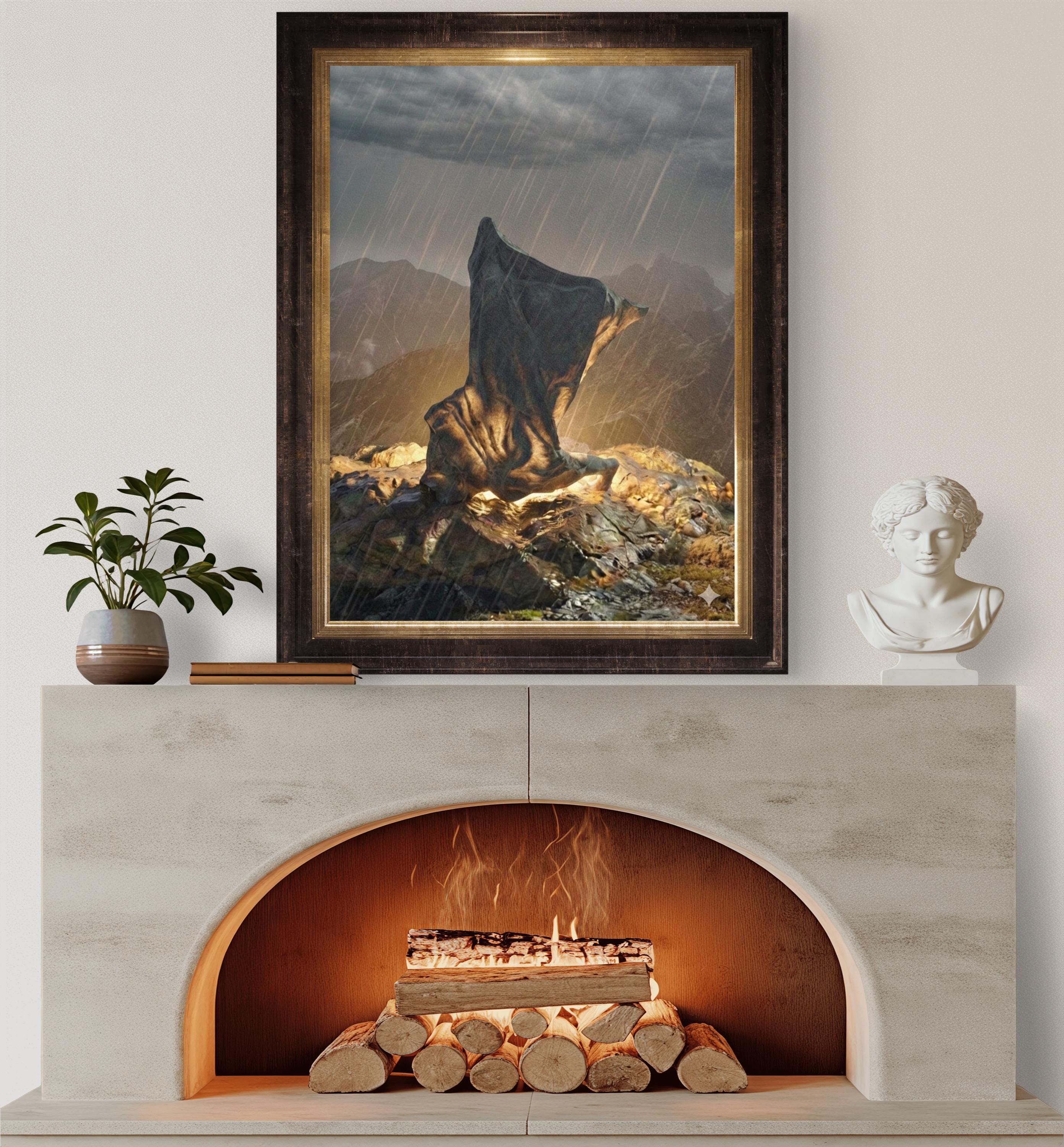 Set against a breathtaking, cinematic backdrop of a mountain range during a fierce storm, the sculpture stands atop a jagged cliff. While the rain falls and dark clouds gather, a warm, golden light emanates from within the bronze folds of the figure’s "garments," symbolizing the unshakable light of prayer and hope that burns even in the darkest times.