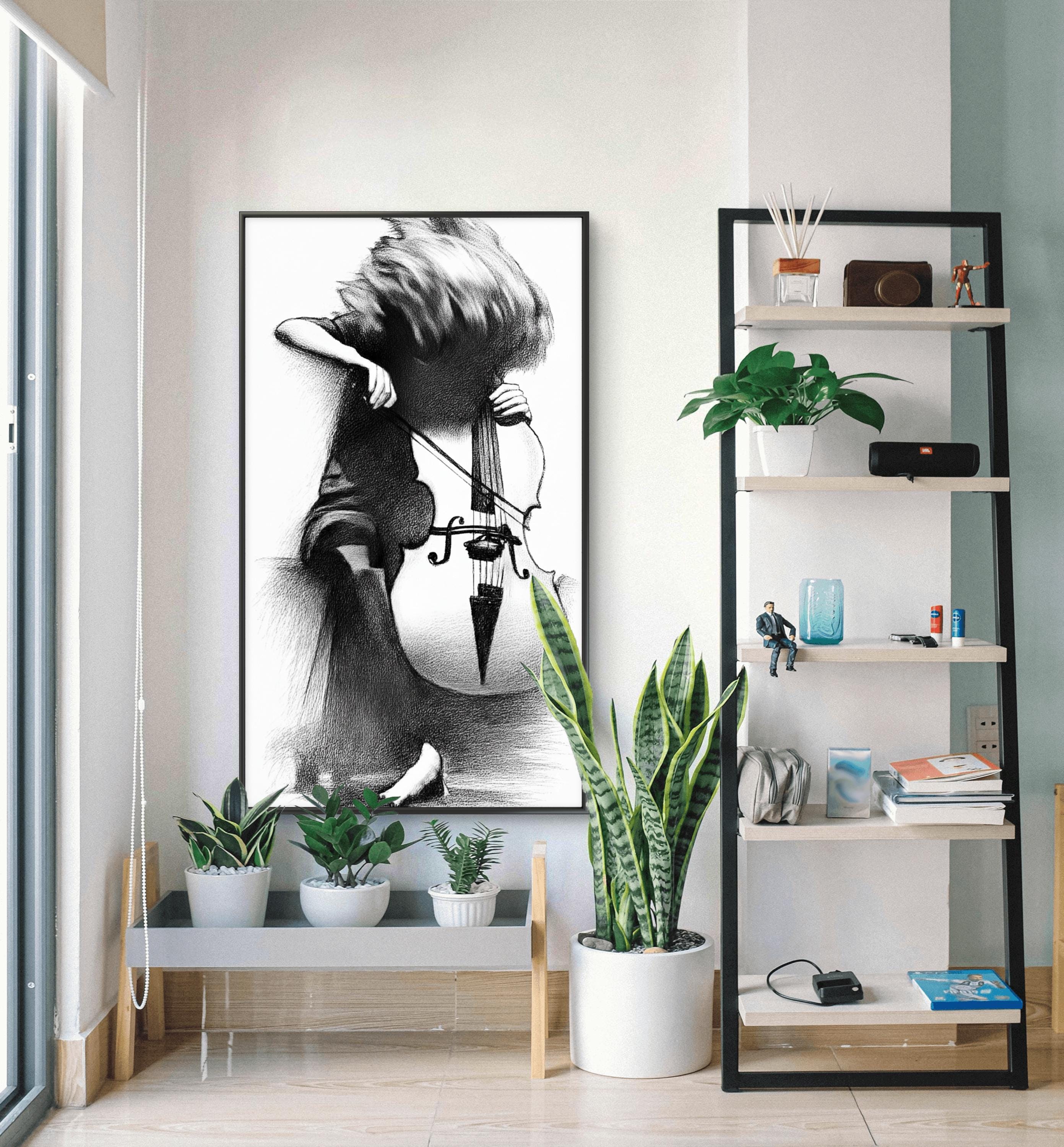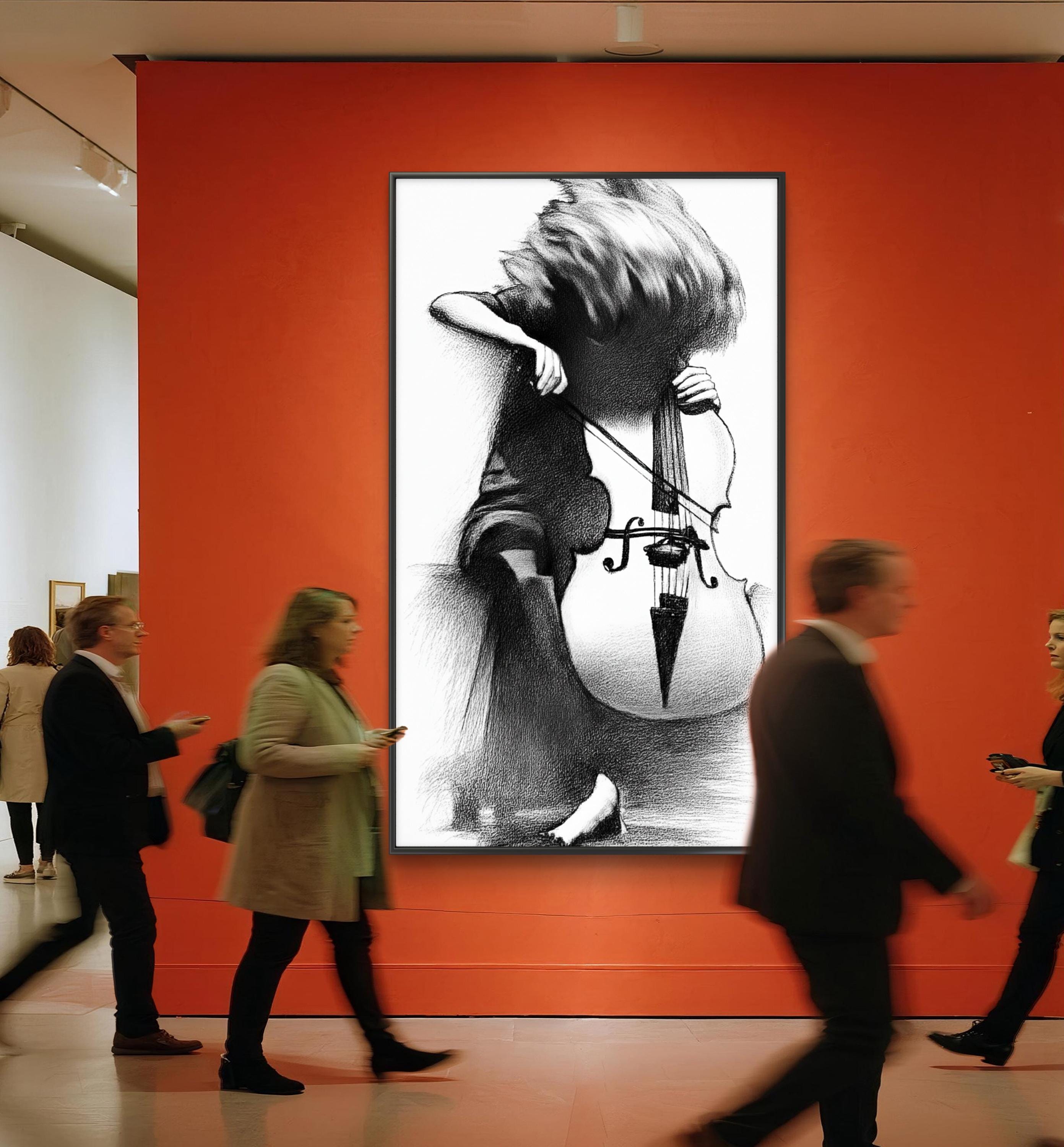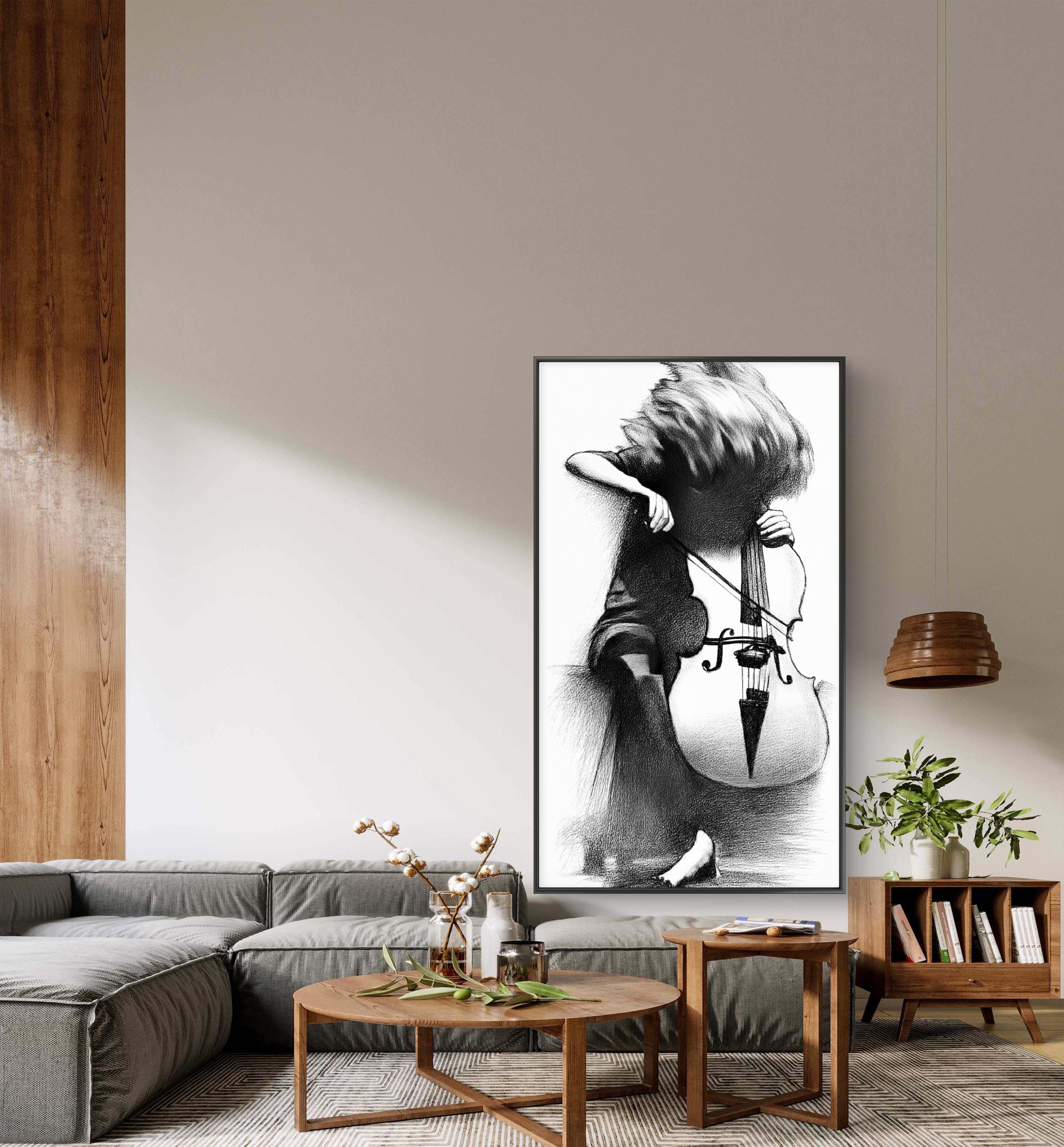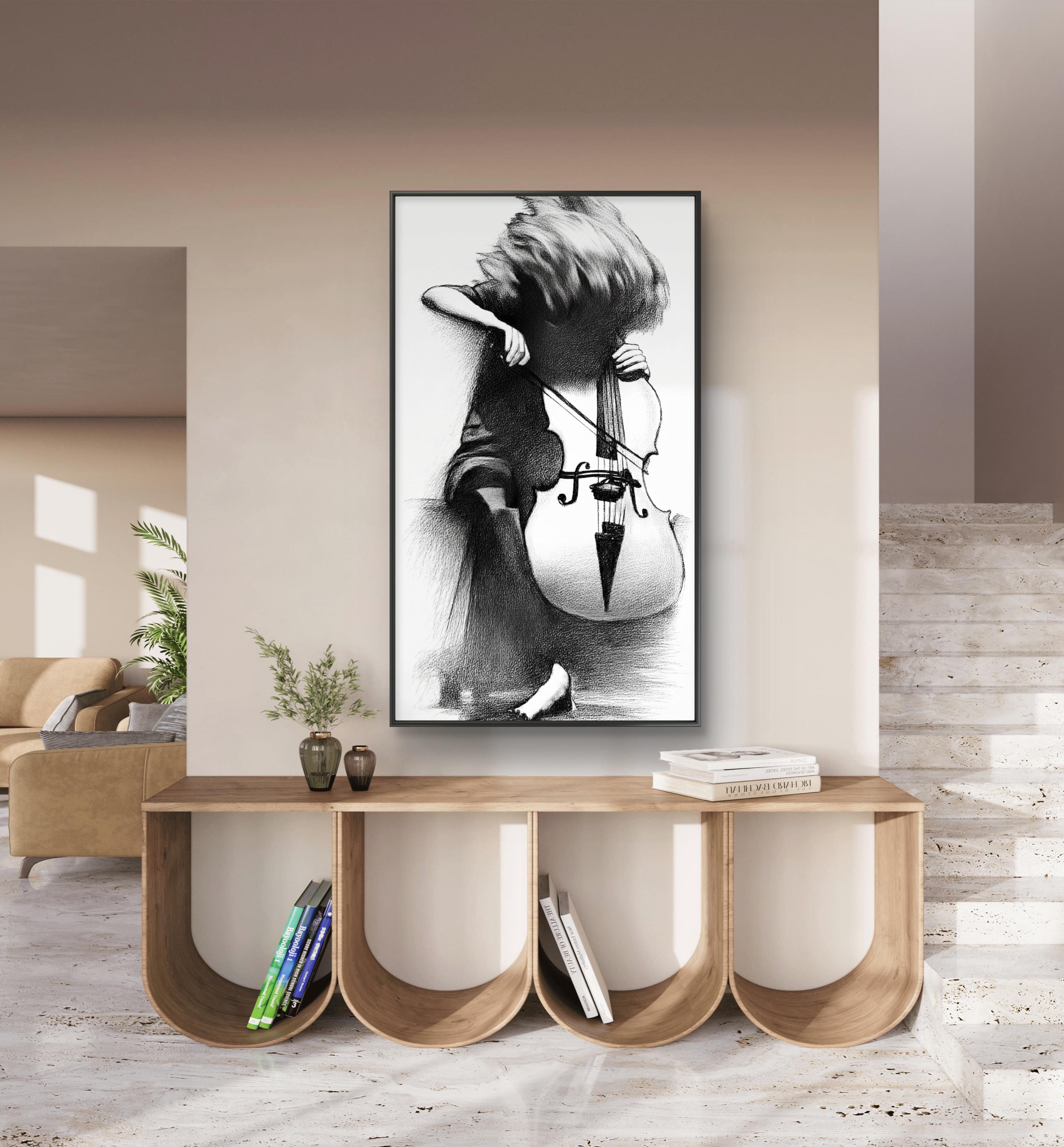 Bring the evocative power of classical music into your home with this stunning charcoal-style sketch. Featuring a female cellist lost in her performance, this piece uses bold shadows and fluid lines to create a sense of movement and deep emotion. The minimalist black-and-white aesthetic makes it a versatile addition to any modern or classic interior.