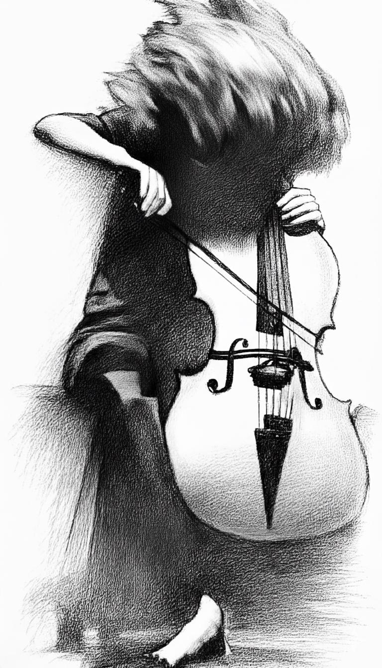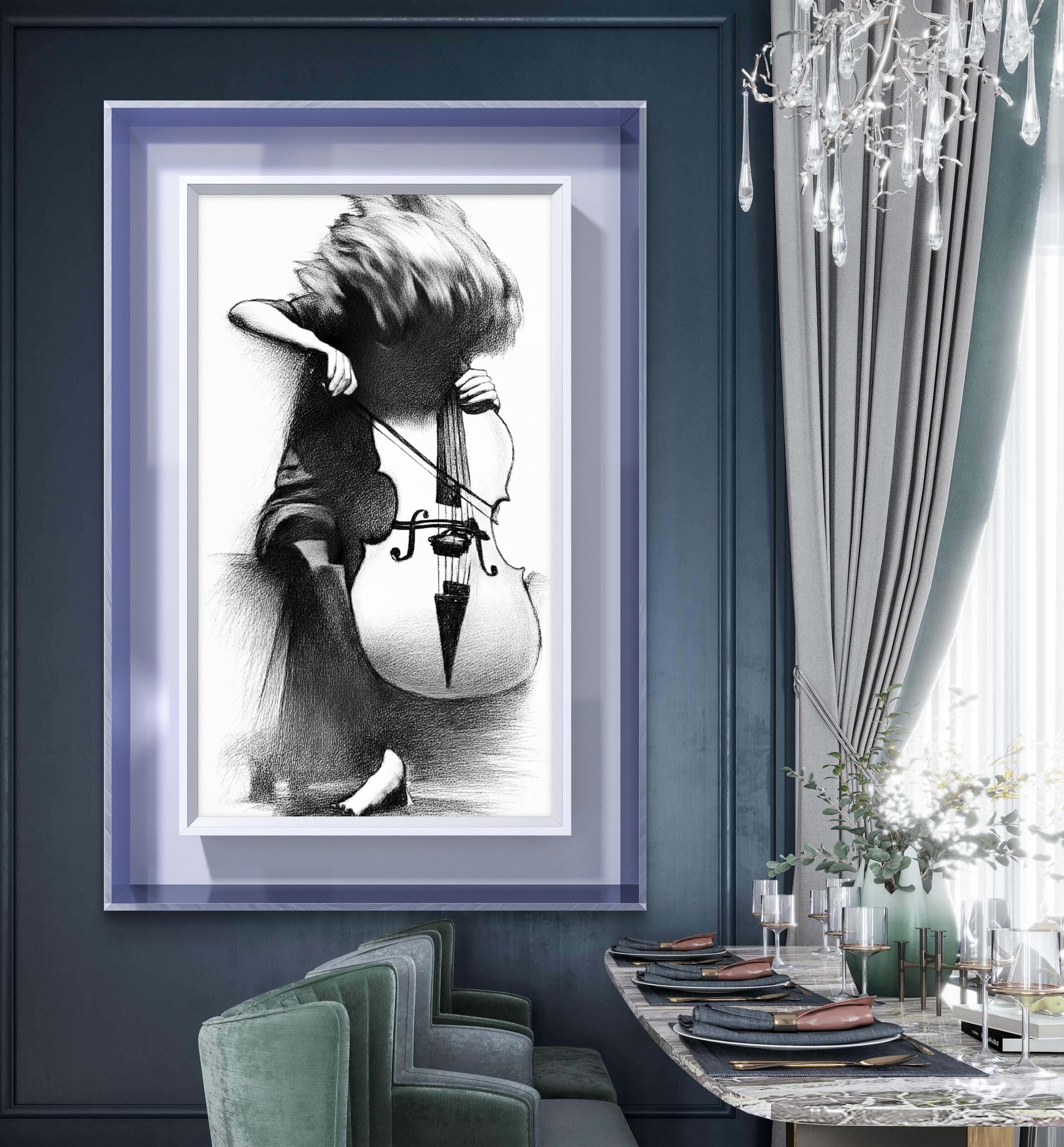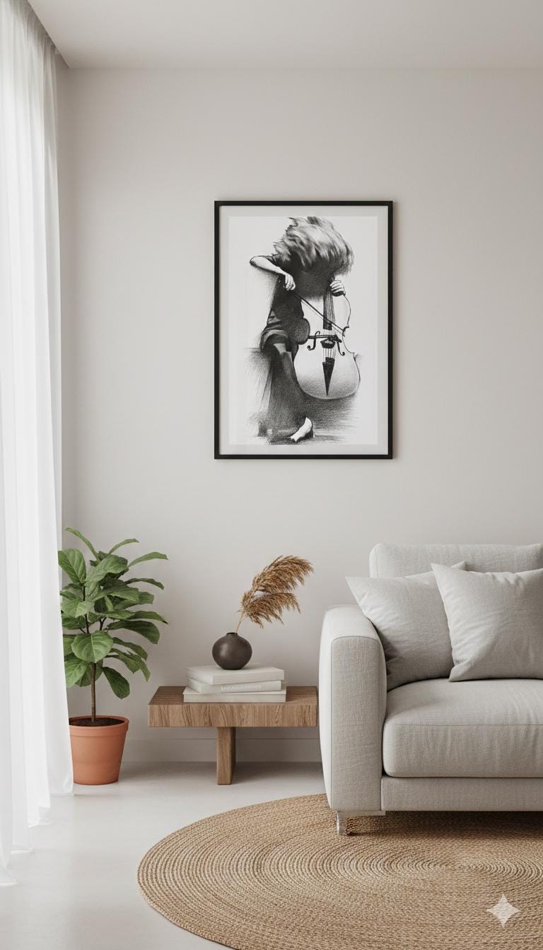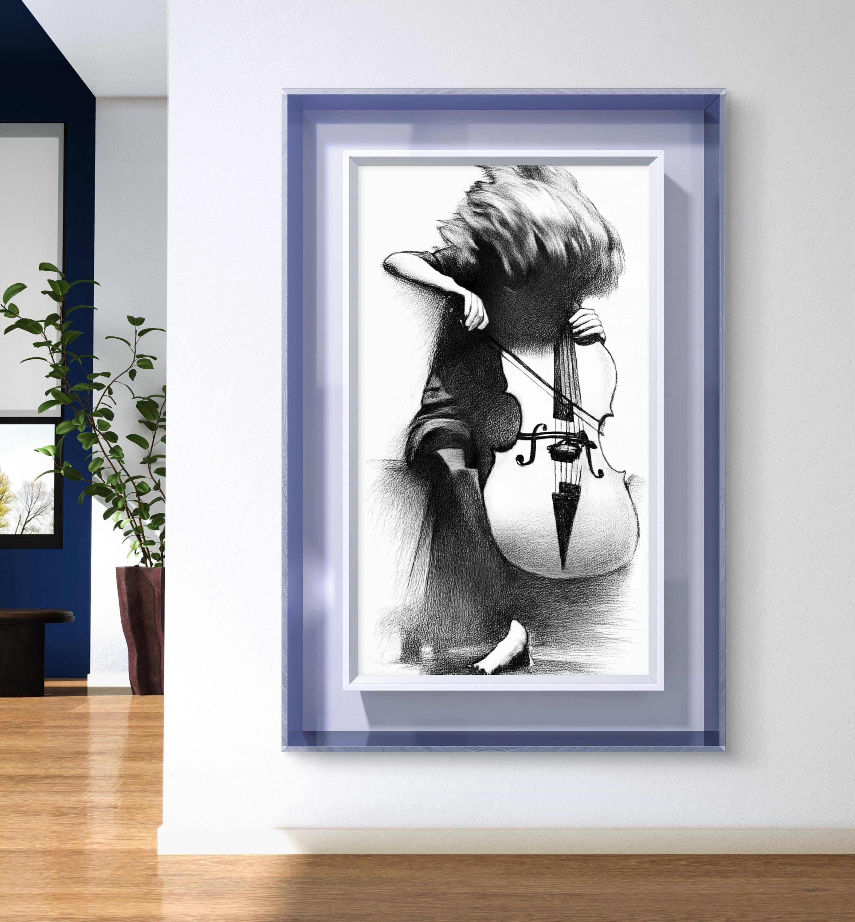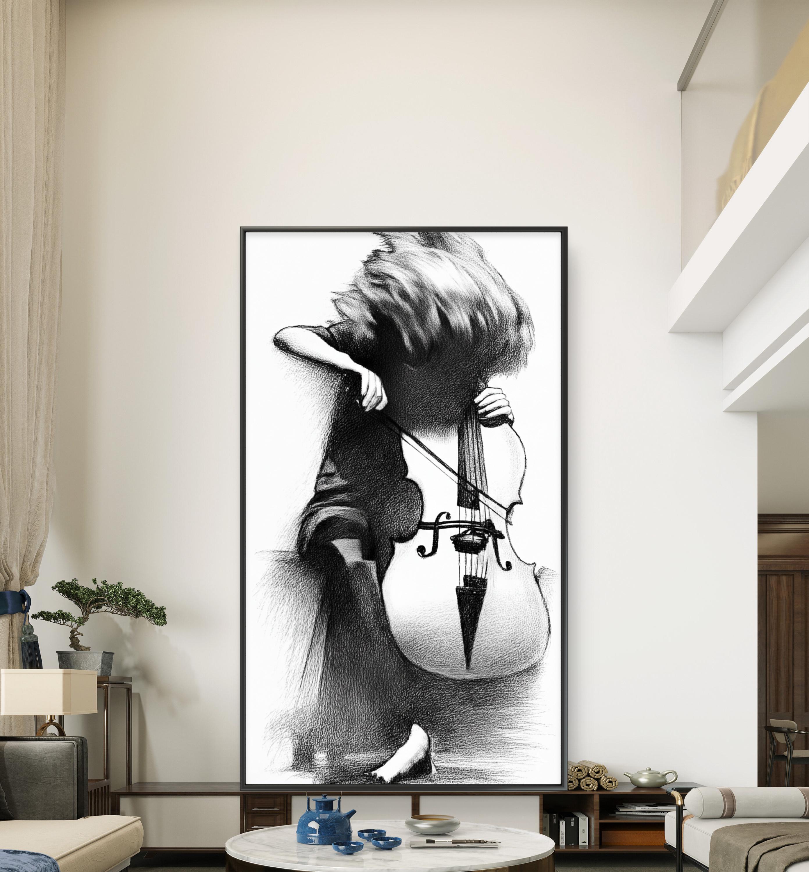Bring the evocative power of classical music into your home with this stunning charcoal-style sketch. Featuring a female cellist lost in her performance, this piece uses bold shadows and fluid lines to create a sense of movement and deep emotion. The minimalist black-and-white aesthetic makes it a versatile addition to any modern or classic interior.