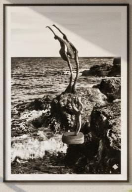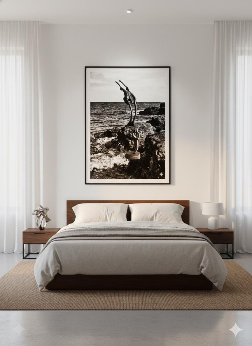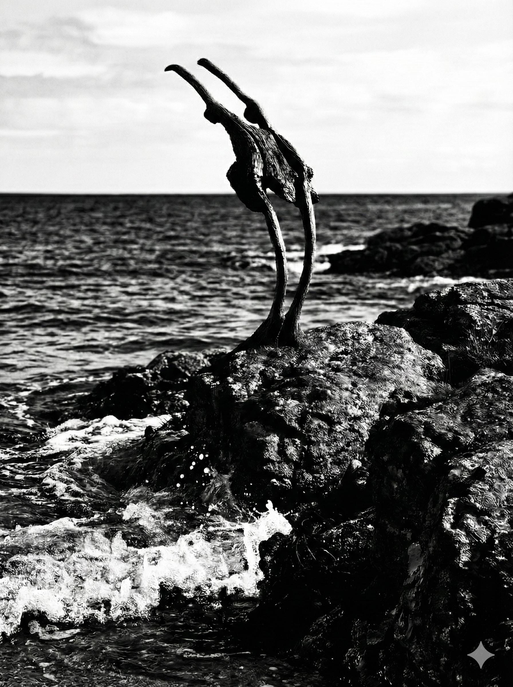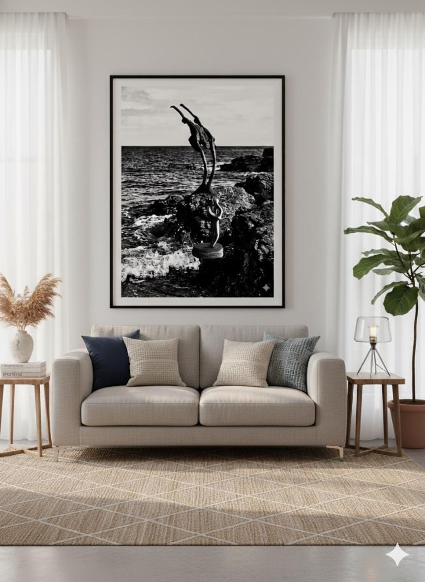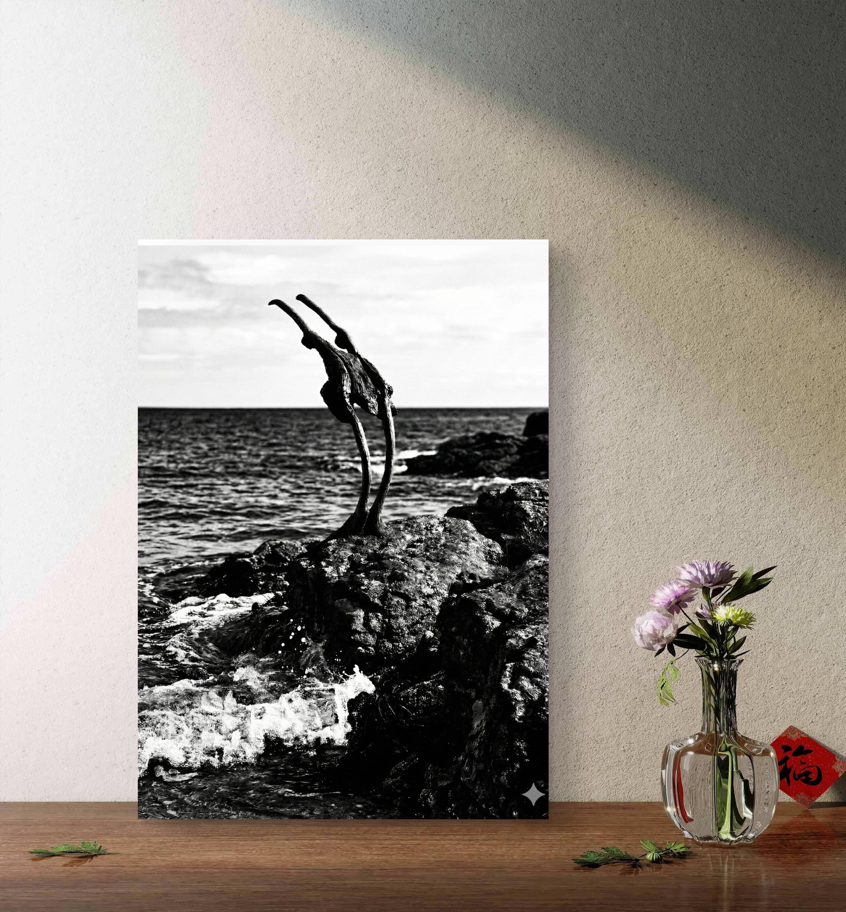 Capture the raw beauty and movement of the coast with this striking black and white fine art photograph. This piece features a unique, tall sculpture of two abstract avian-like figures poised atop a jagged rock, overlooking a restless sea. The high-contrast monochrome tones emphasize the texture of the splashing waves and the weathered surface of the stones, creating a timeless, cinematic atmosphere.