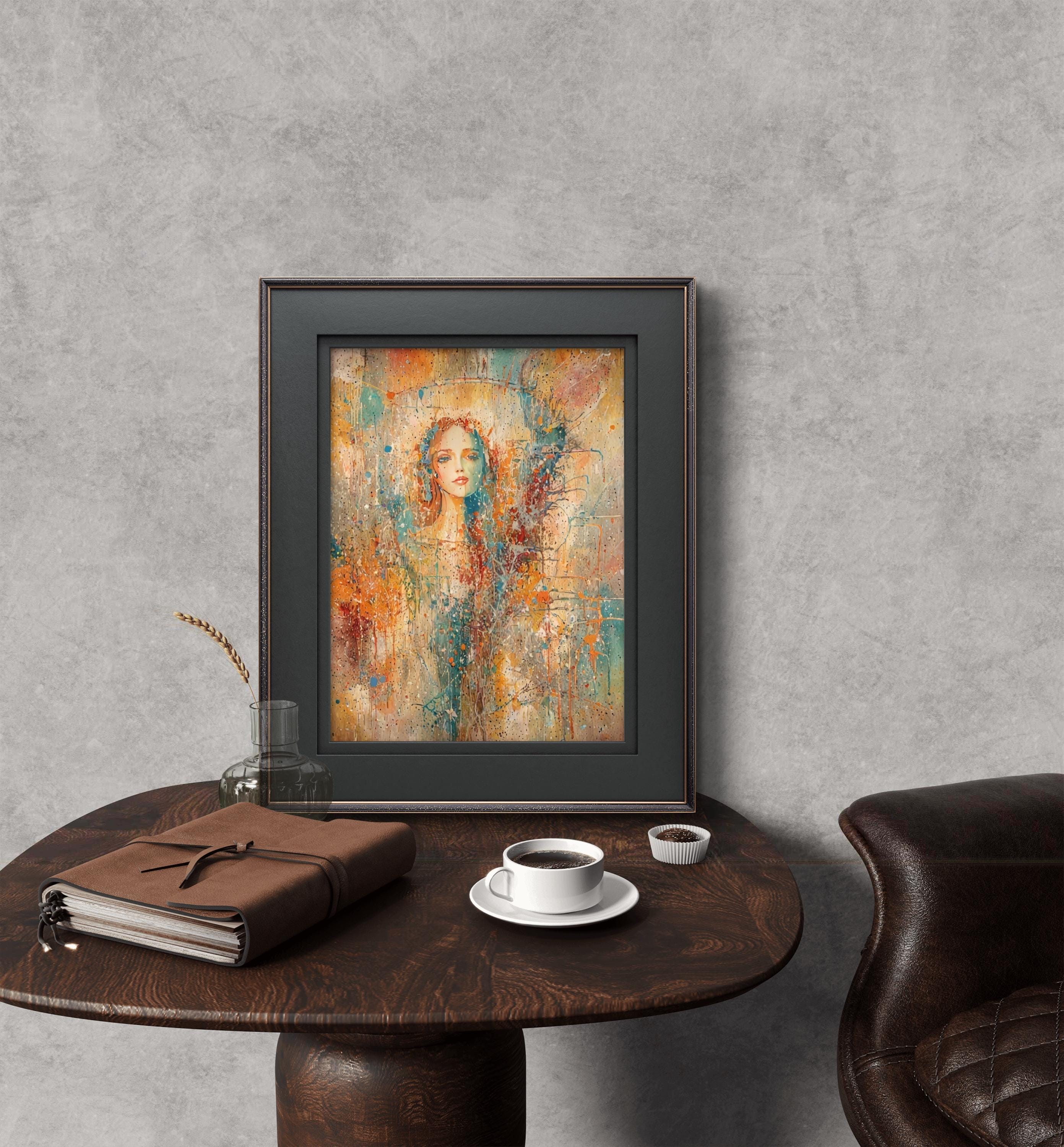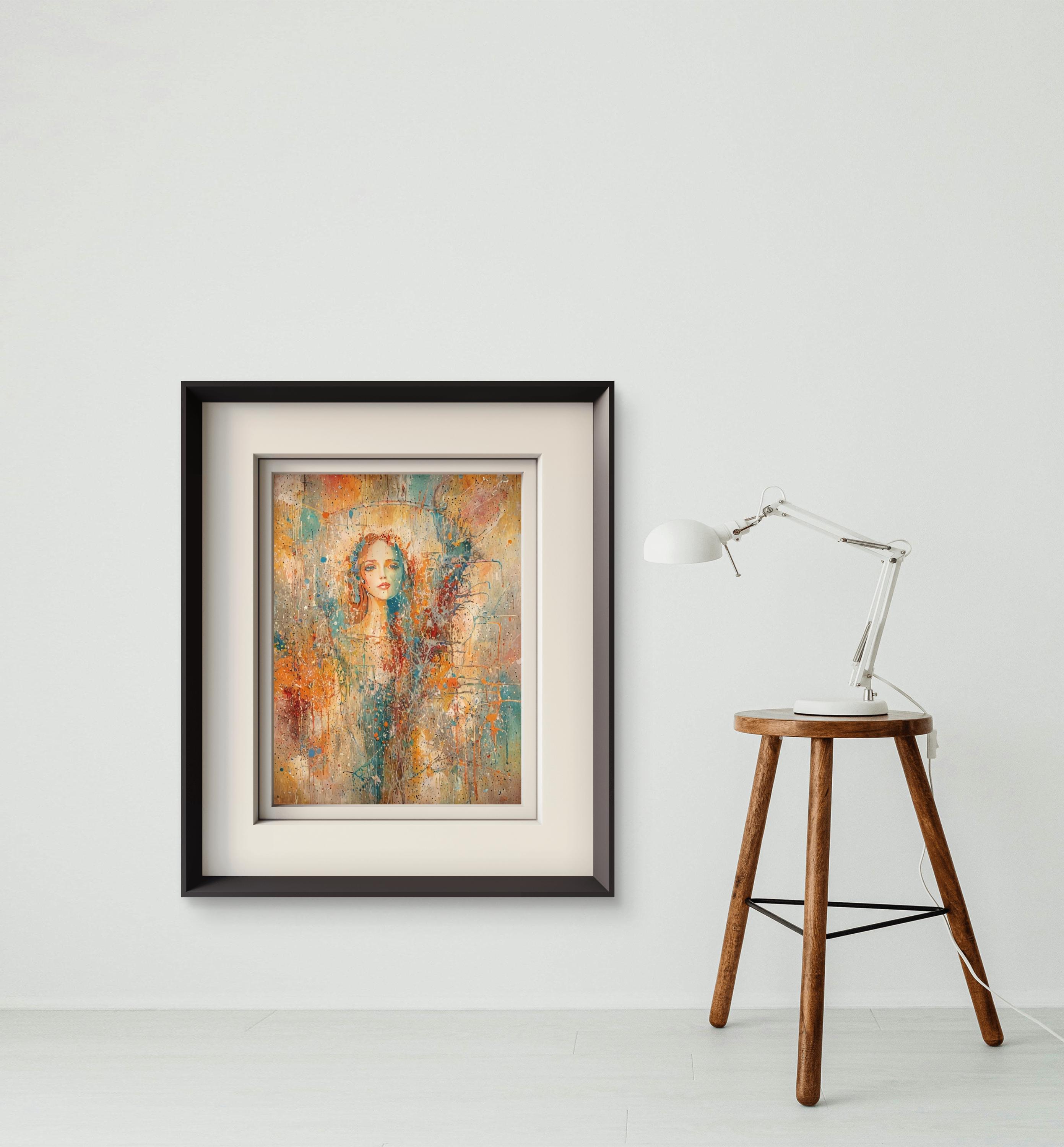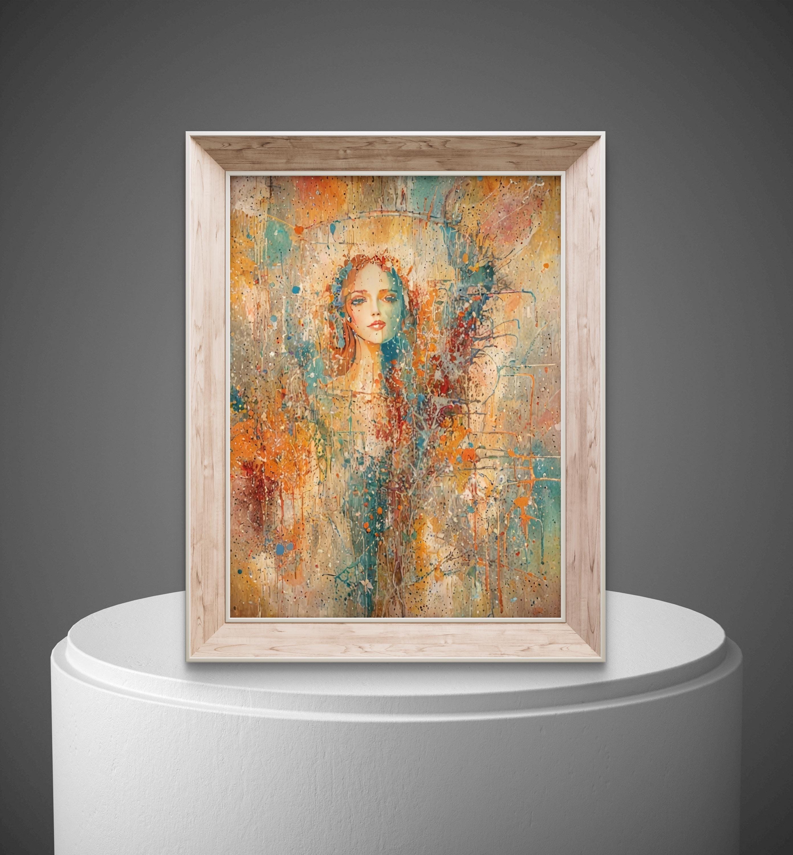 This stunning piece of art blends the delicate features of a female face with a vibrant, abstract world of color and texture. Using a unique mixed-media style that mimics watercolor splatters and impressionist brushwork, this artwork evokes a sense of mystery, beauty, and modern elegance. Adding a focal point to a modern living room or bedroom.