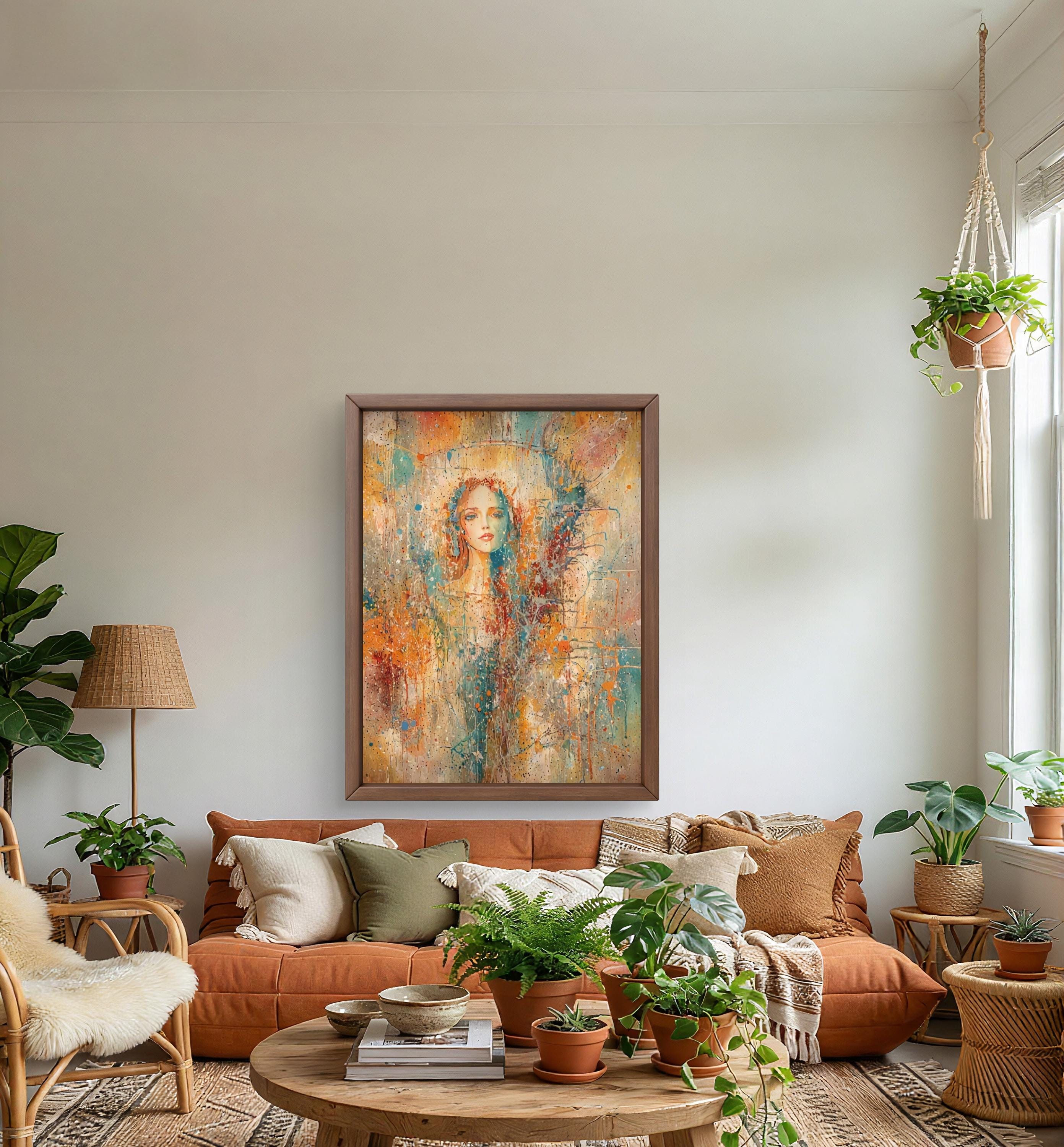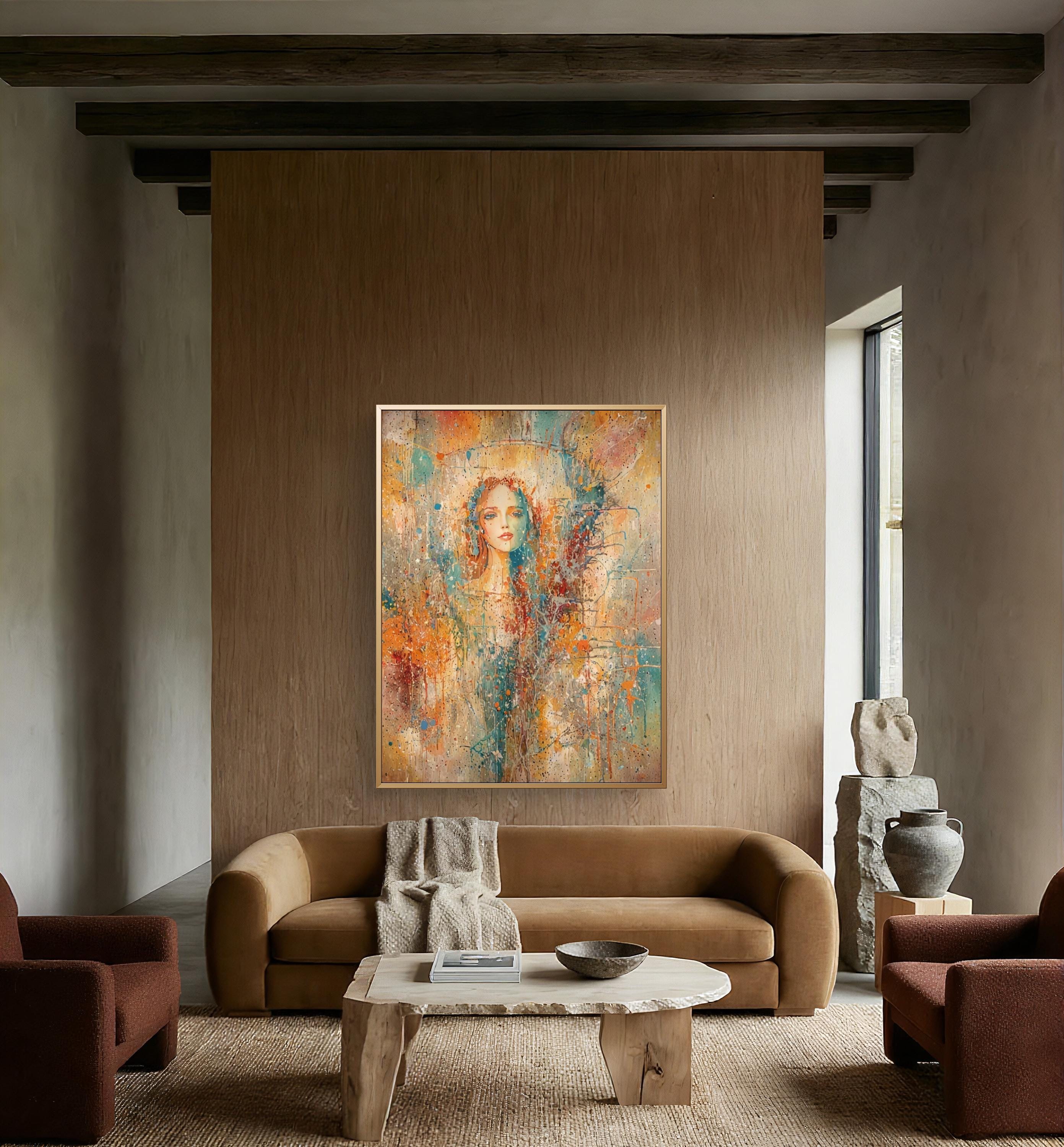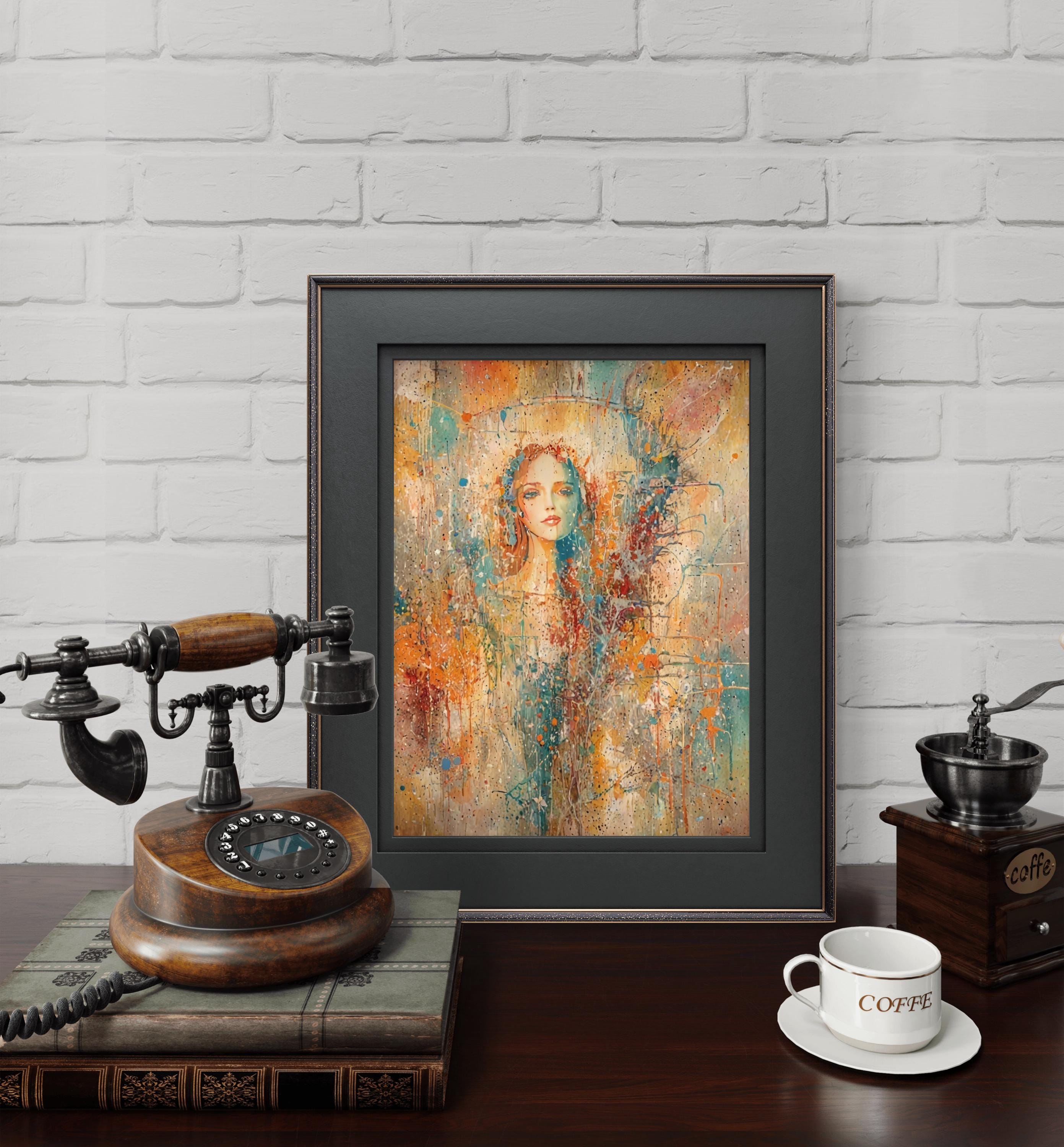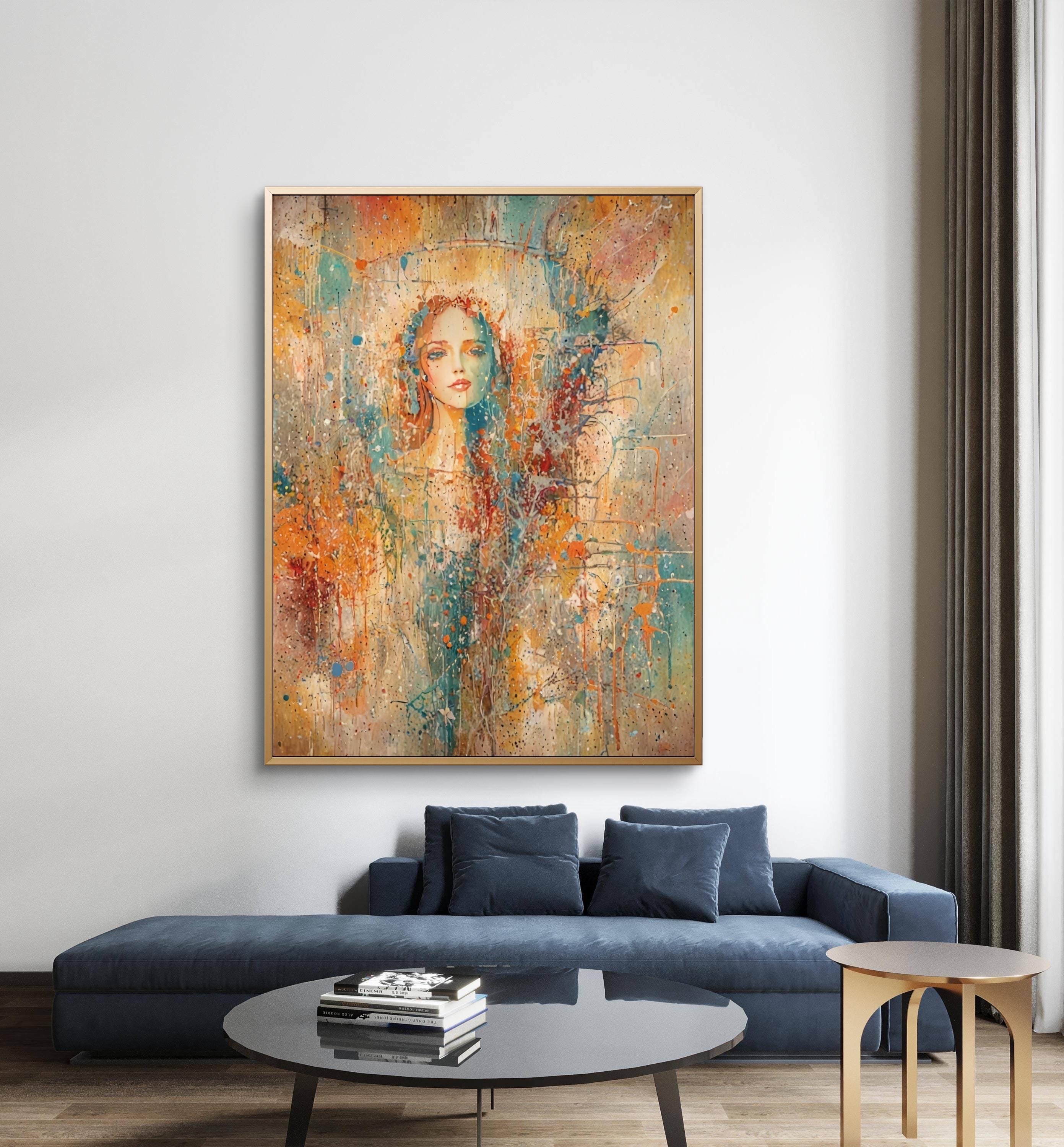 This stunning piece of art blends the delicate features of a female face with a vibrant, abstract world of color and texture. Using a unique mixed-media style that mimics watercolor splatters and impressionist brushwork, this artwork evokes a sense of mystery, beauty, and modern elegance. Adding a focal point to a modern living room or bedroom.