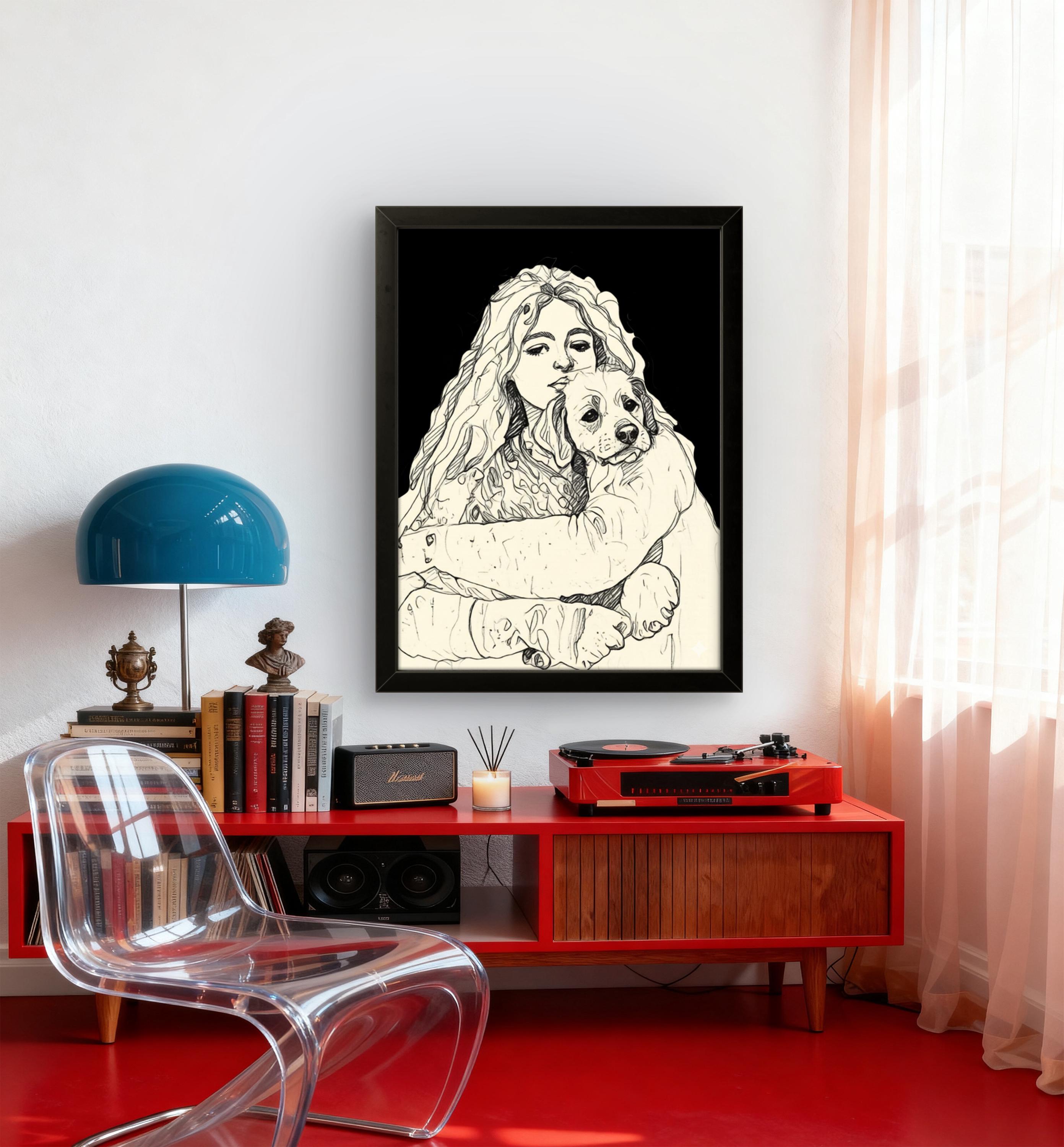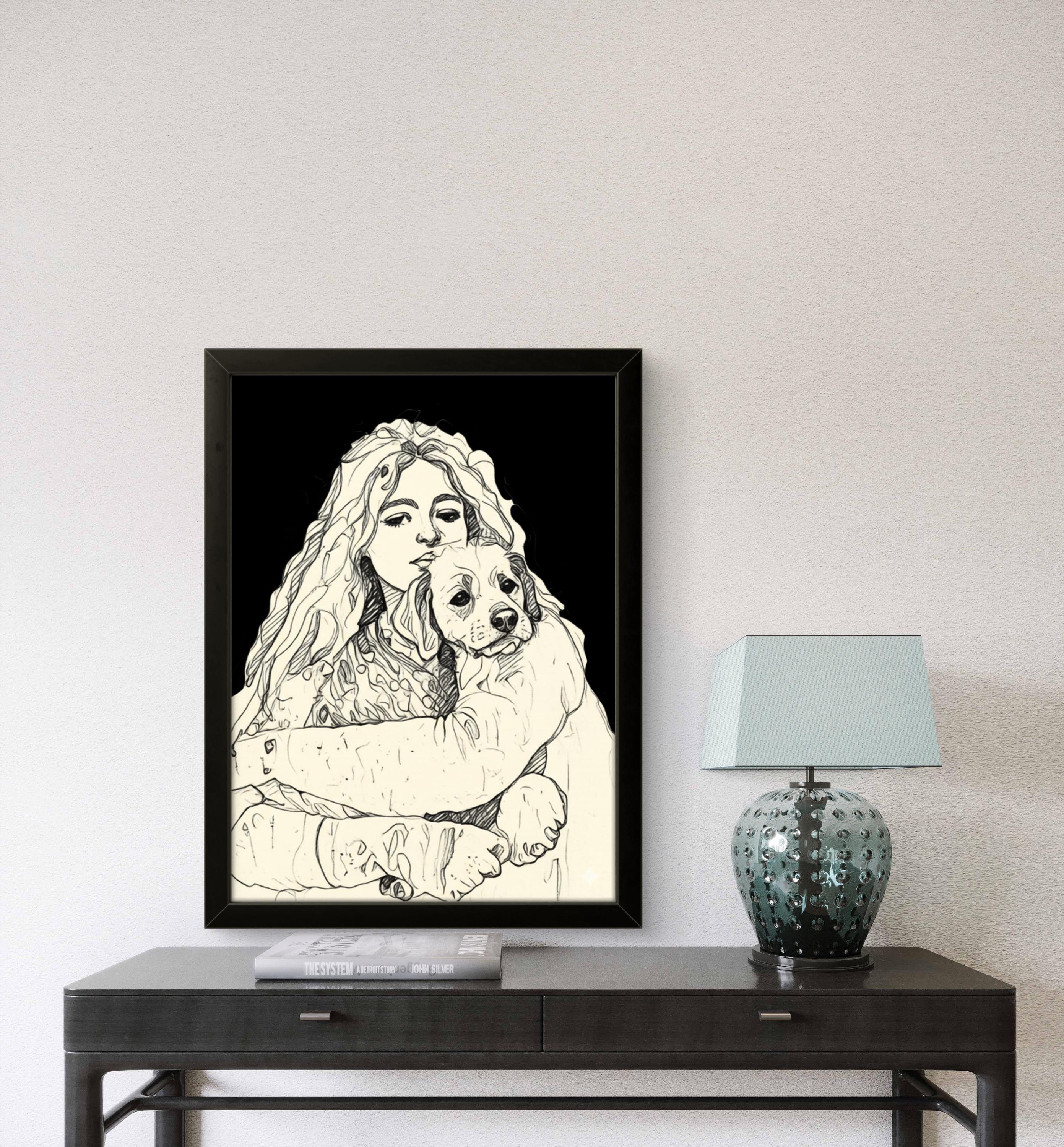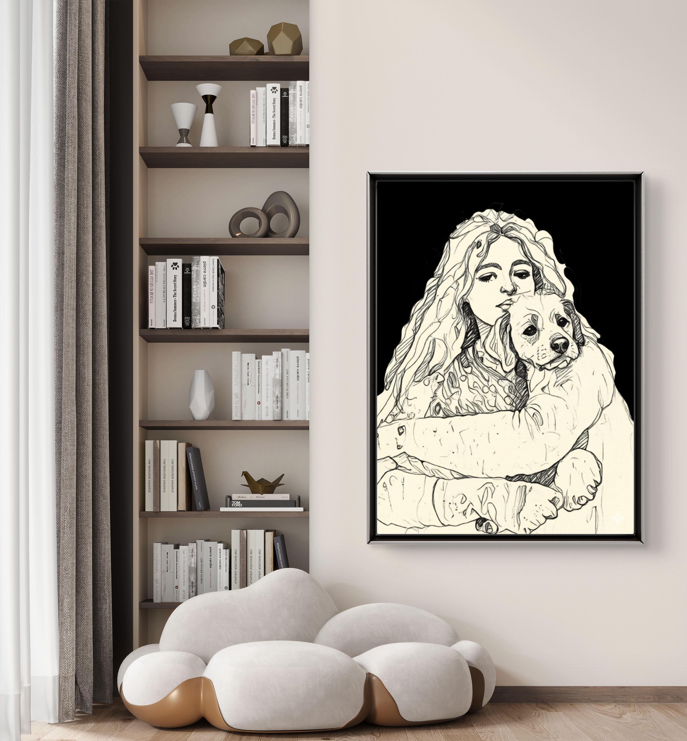 Black &white Woman imbrace HER Dog Art Print acrylic femily room figurative watercolor Painting