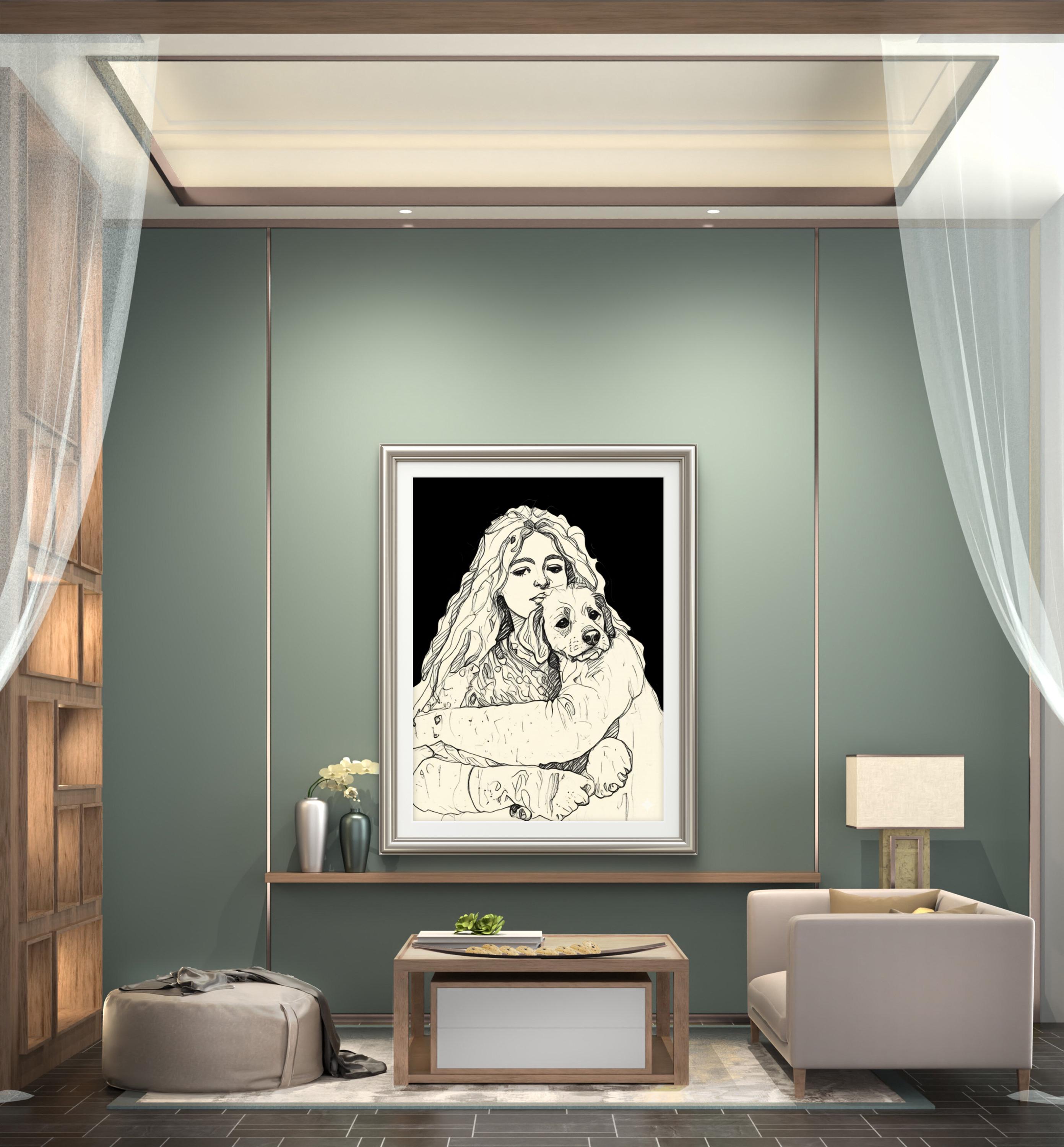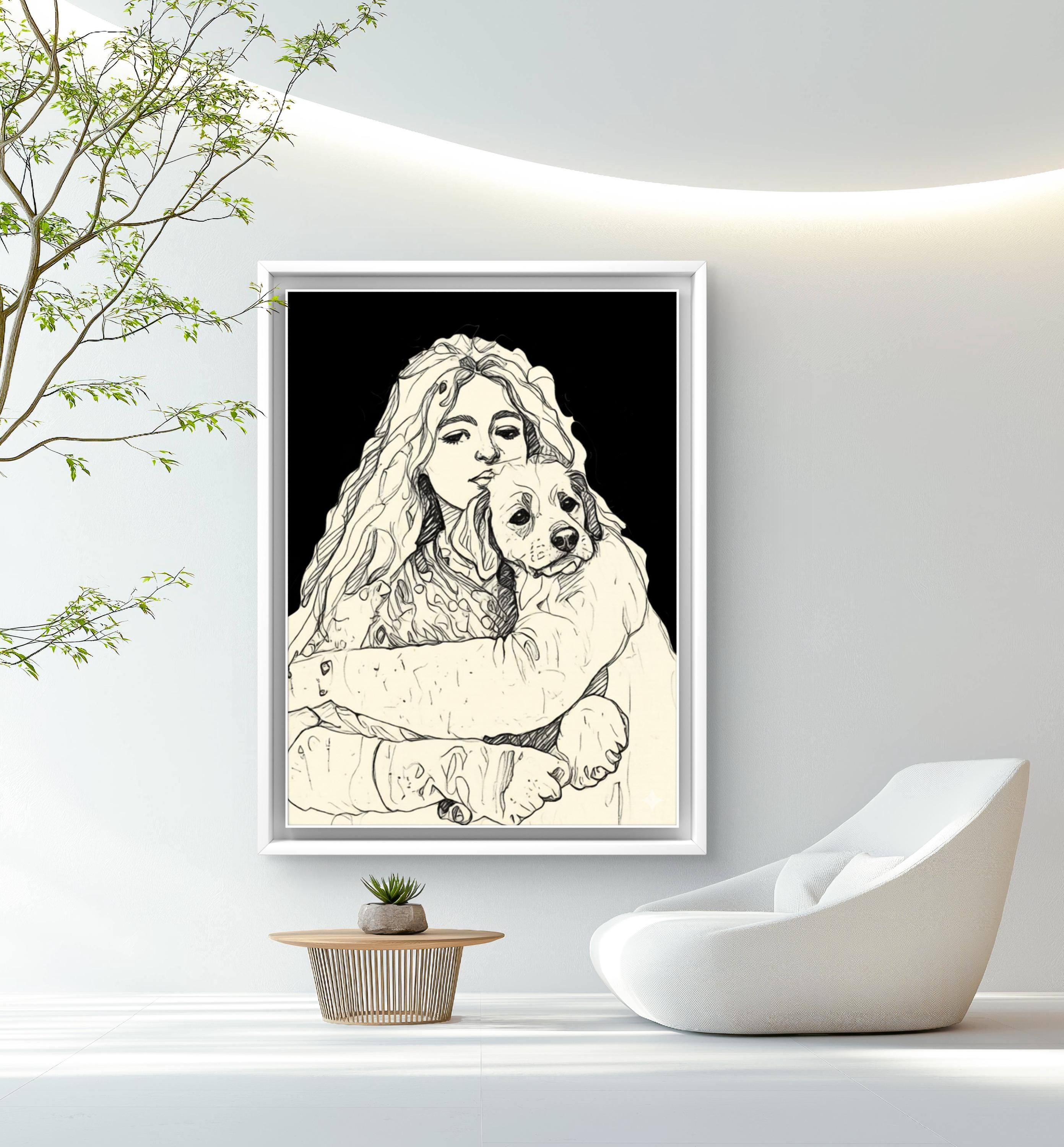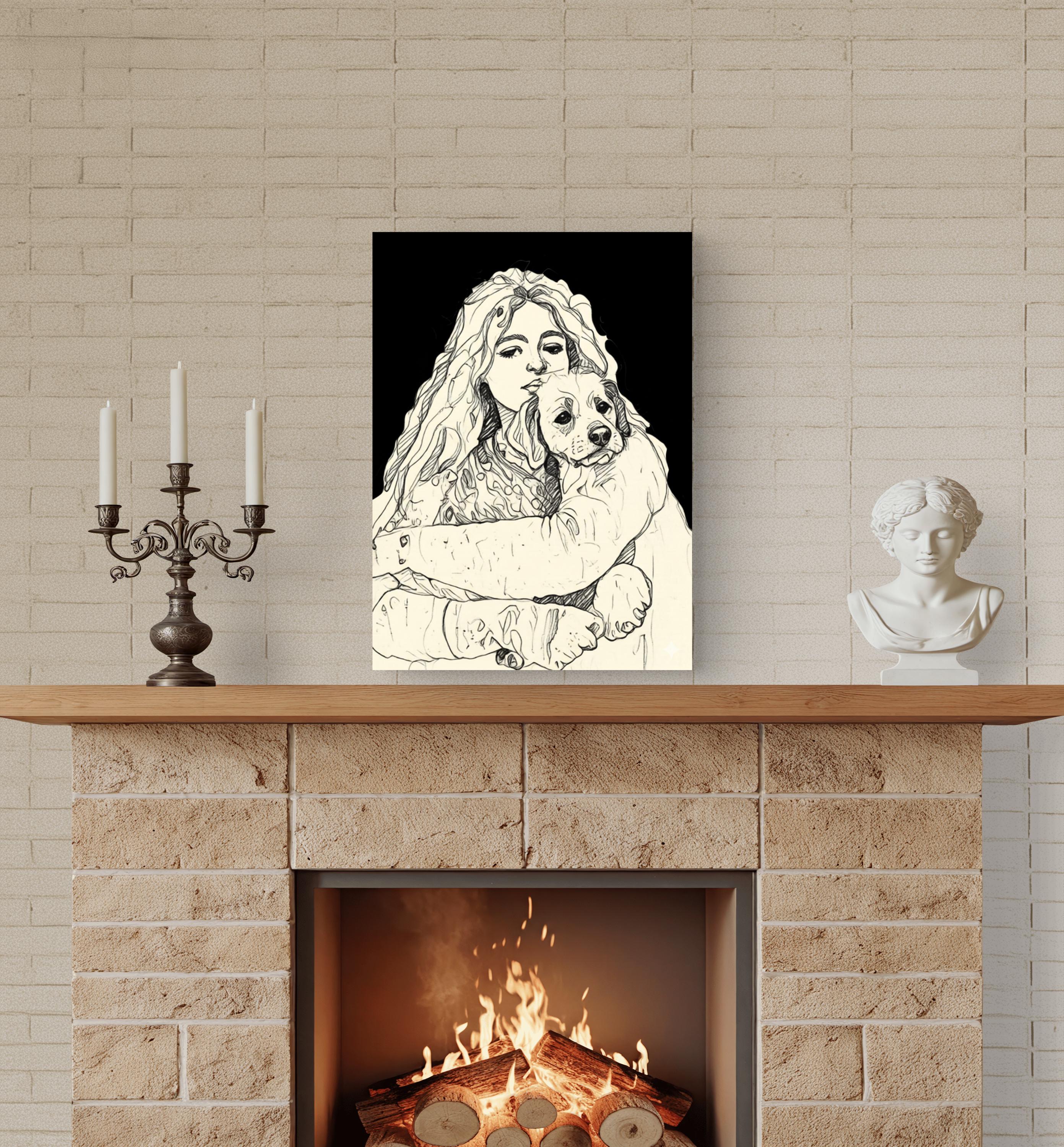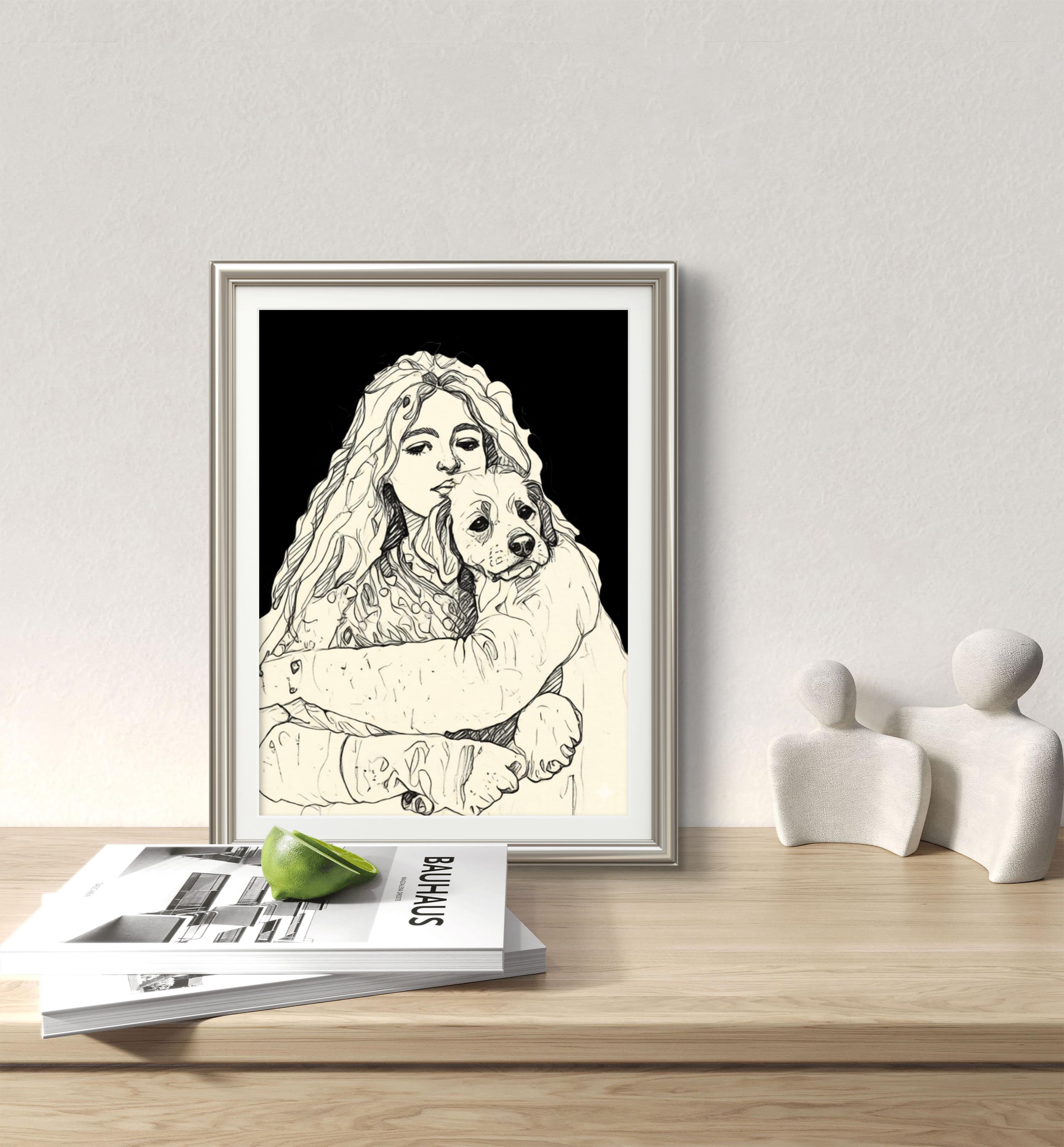 Black &white Woman imbrace HER Dog Art Print acrylic femily room figurative watercolor Painting