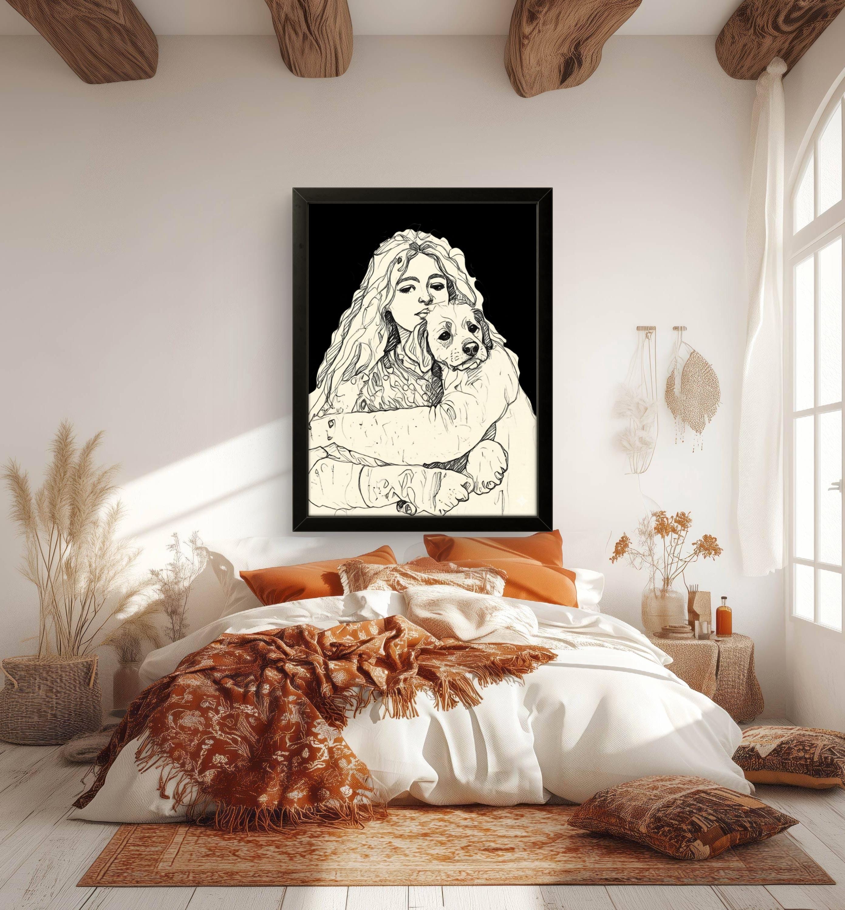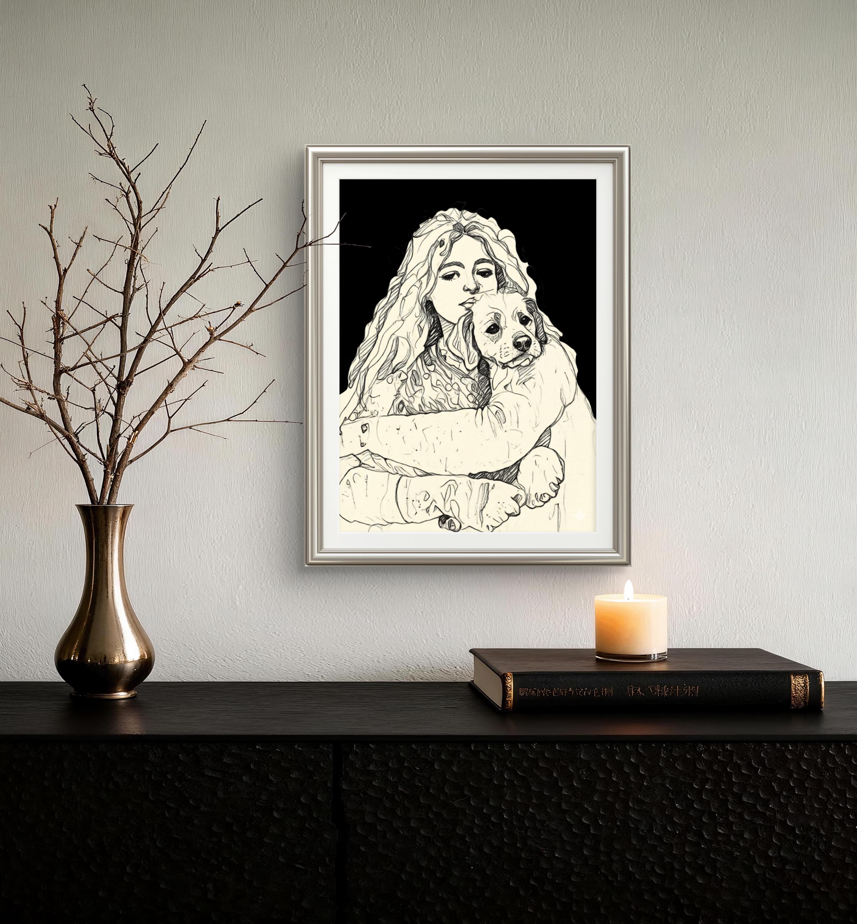 Dreamlike Abstract Art Print of Woman and Dog Embrace