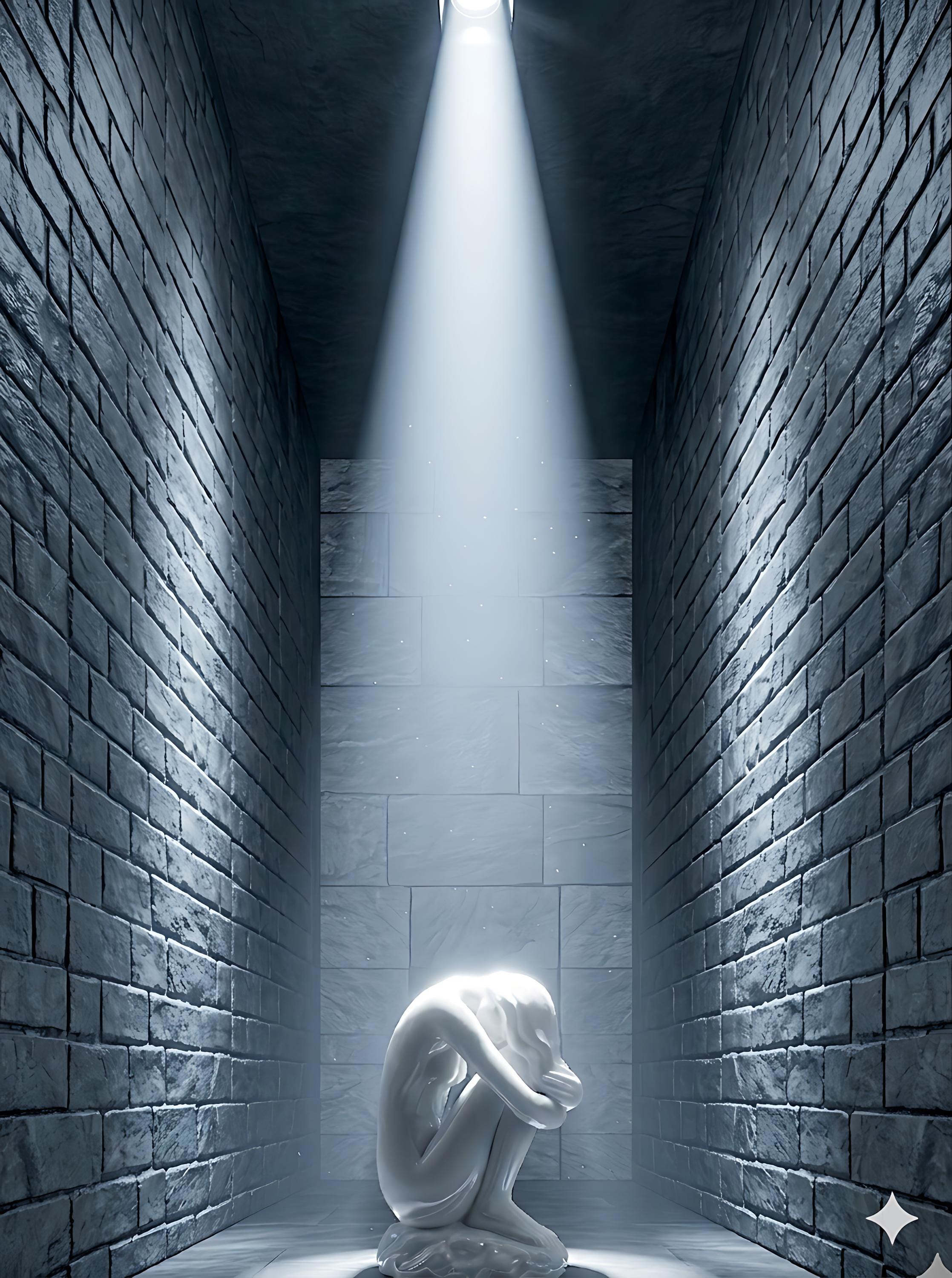 Surrealist minimalist Sculpture Art Print - Contemplative Nude in a Modern Stone Hallway -
