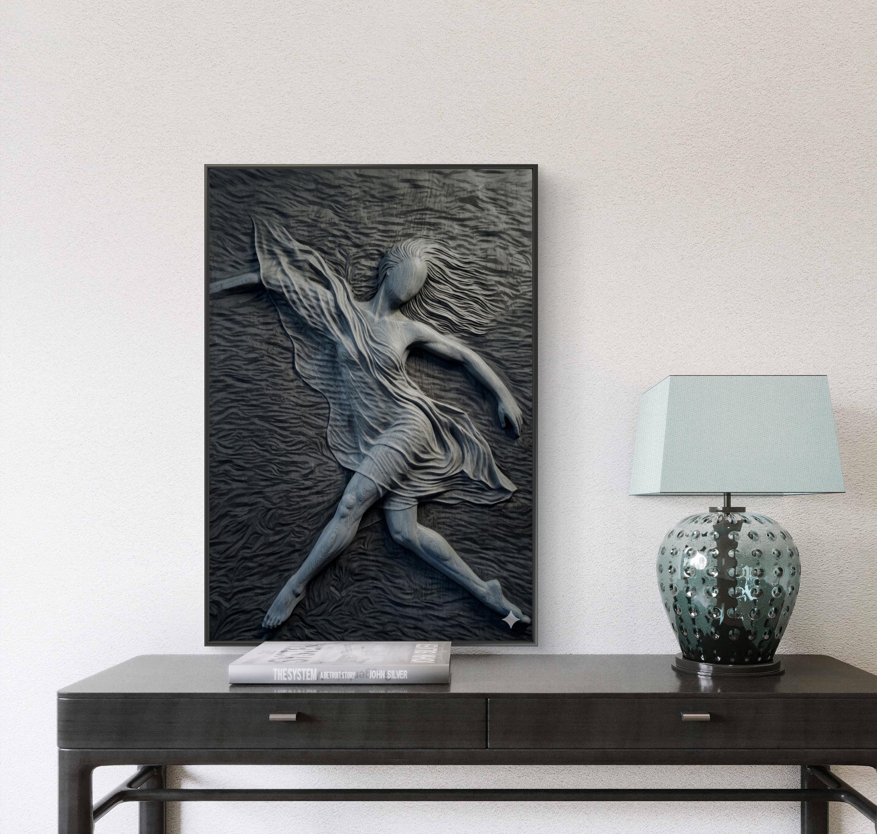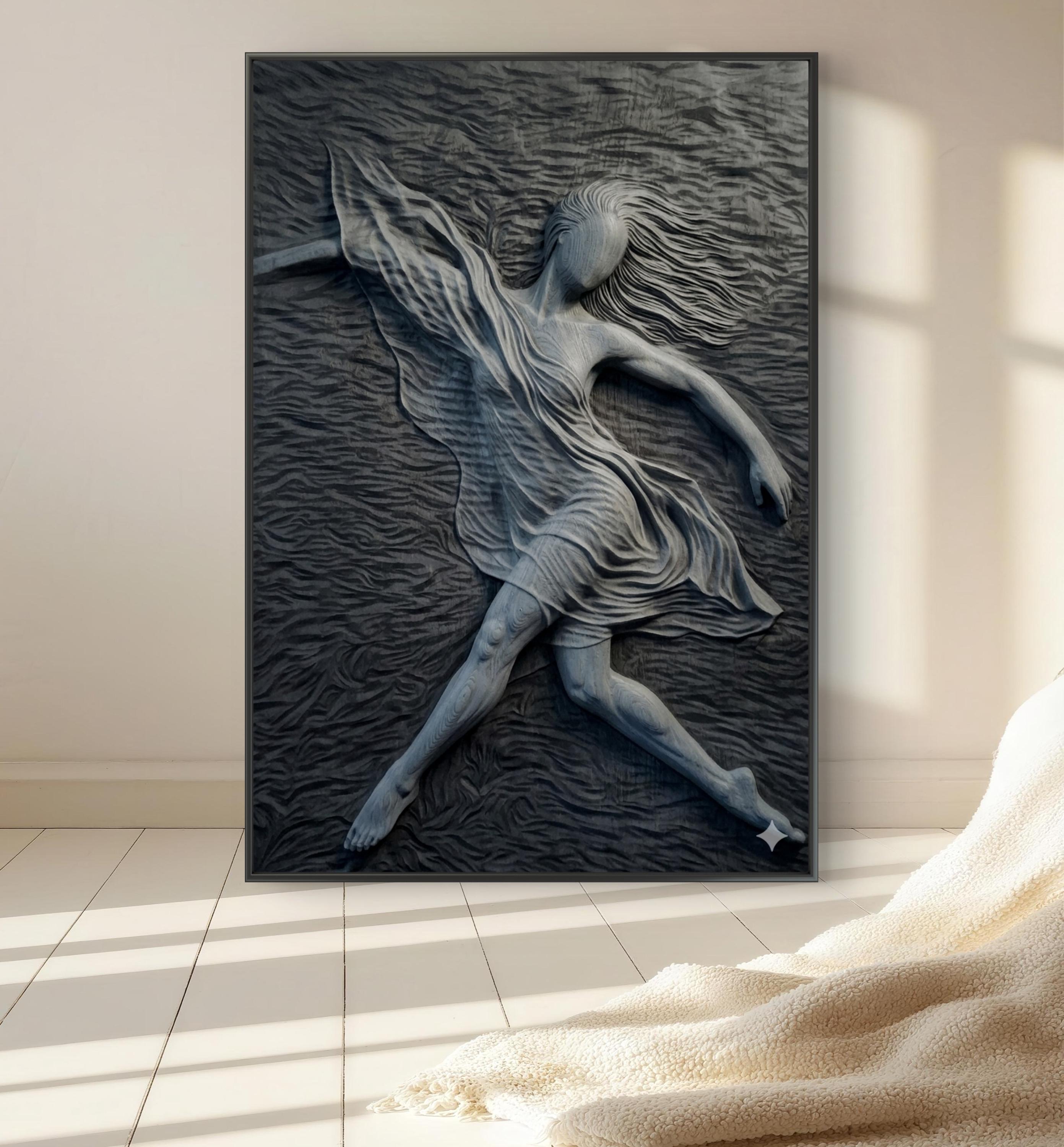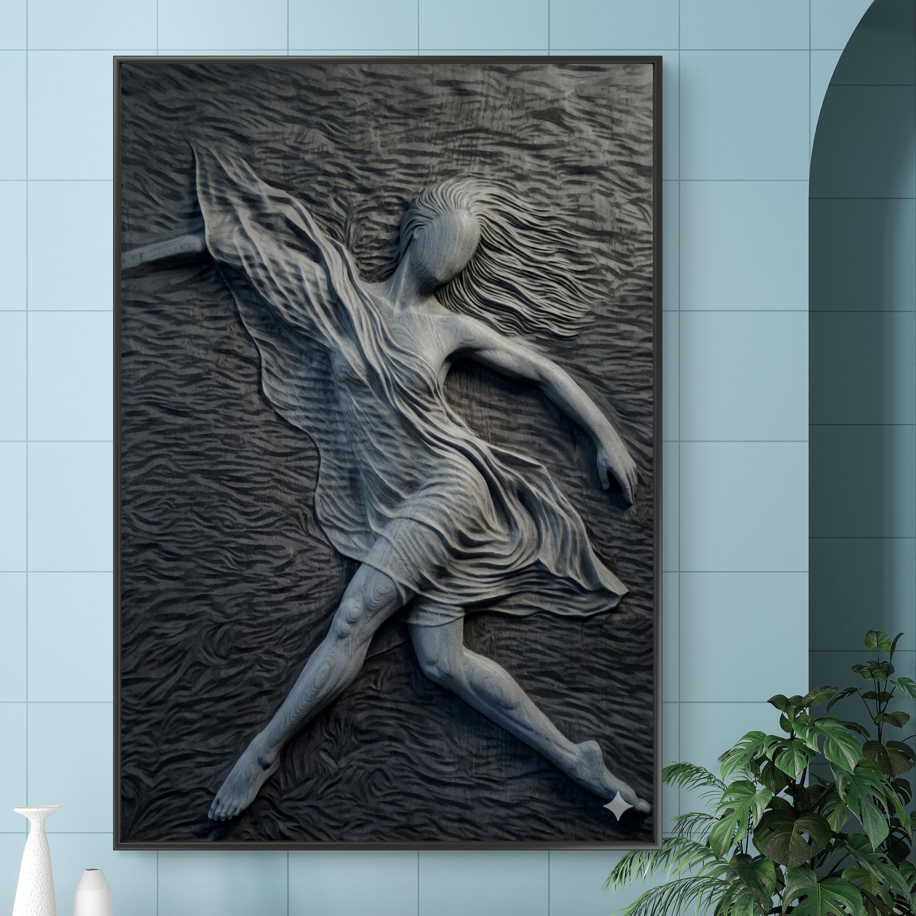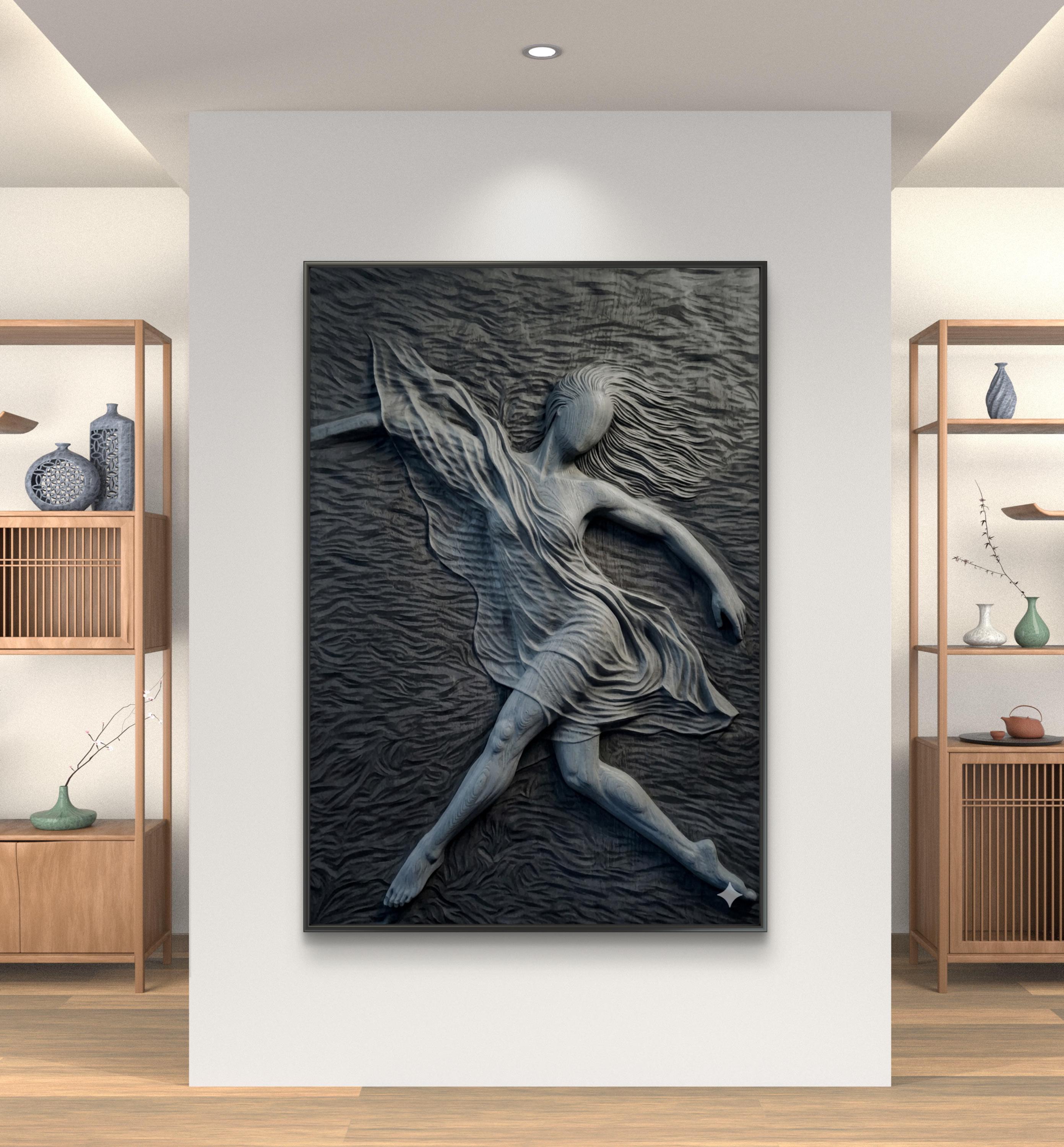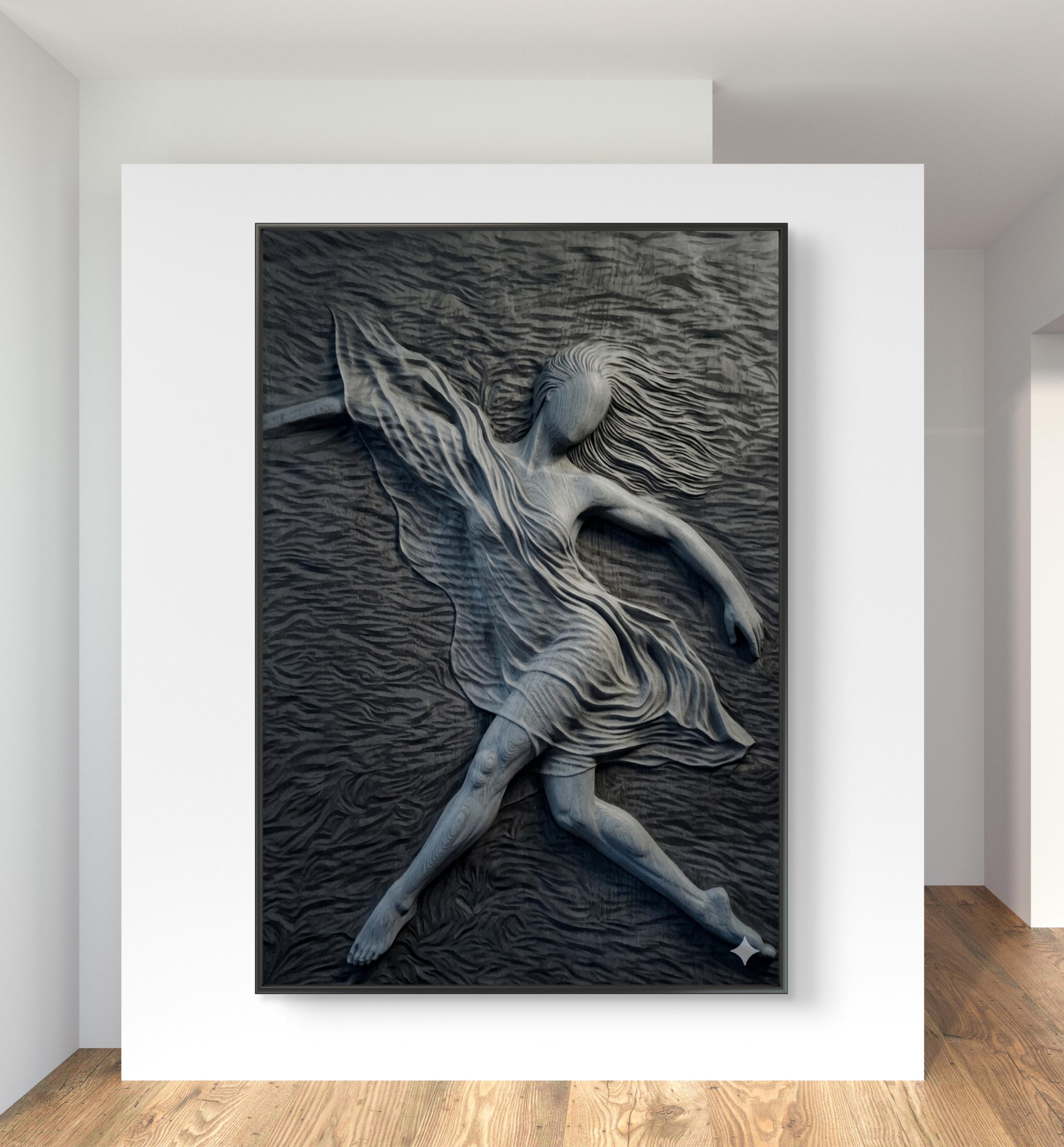 Sculpture the Fluidity of Motion transform your living space with this breathtaking bas-relief sculpture. This piece depicts a woman in a state of ethereal suspension, her form emerging from a sea of meticulously carved ripples. The soft, delicate textures of her flowing dress contrast beautifully with the rhythmic, wave-like background, creating a sense of dynamic calm.