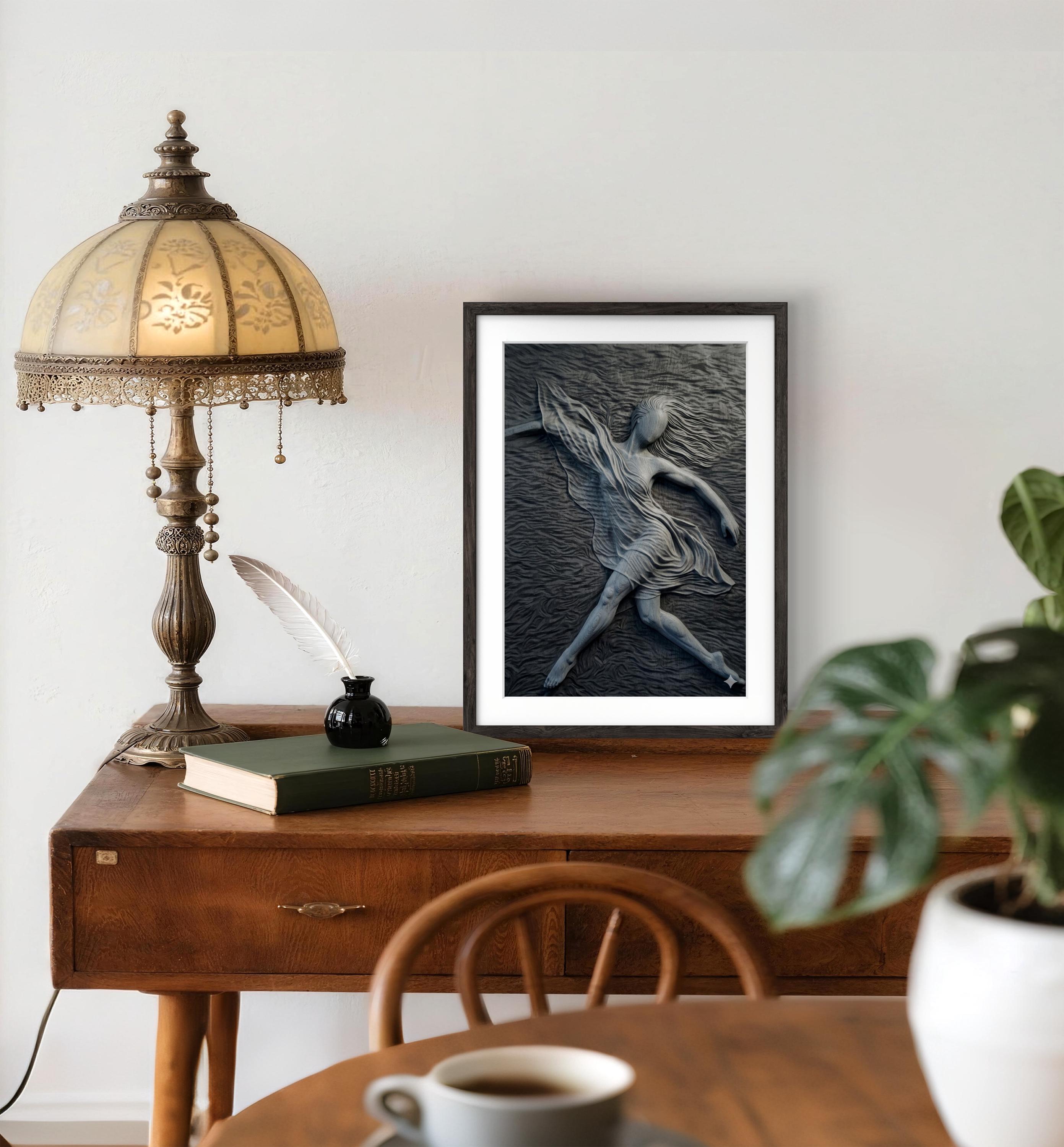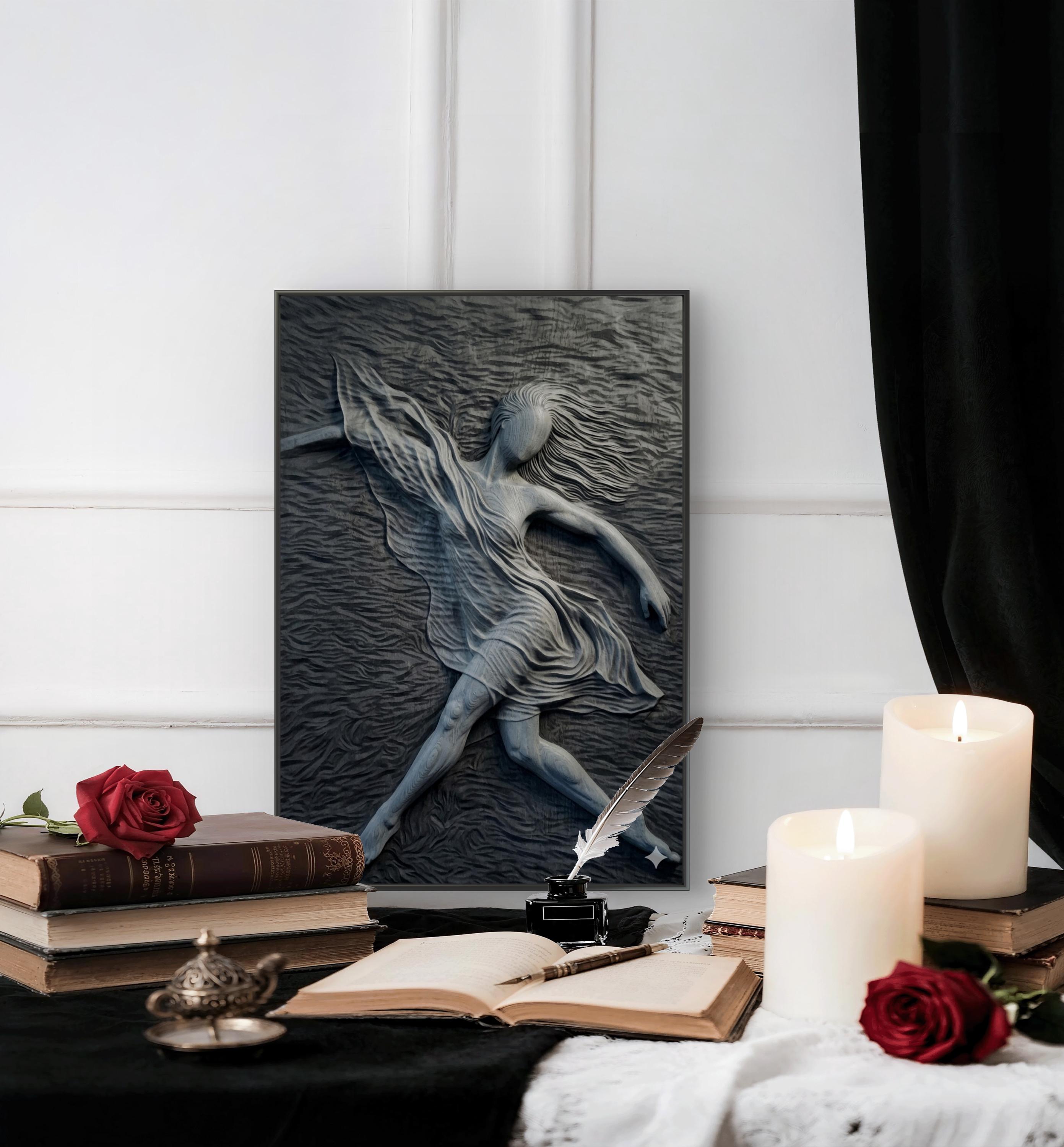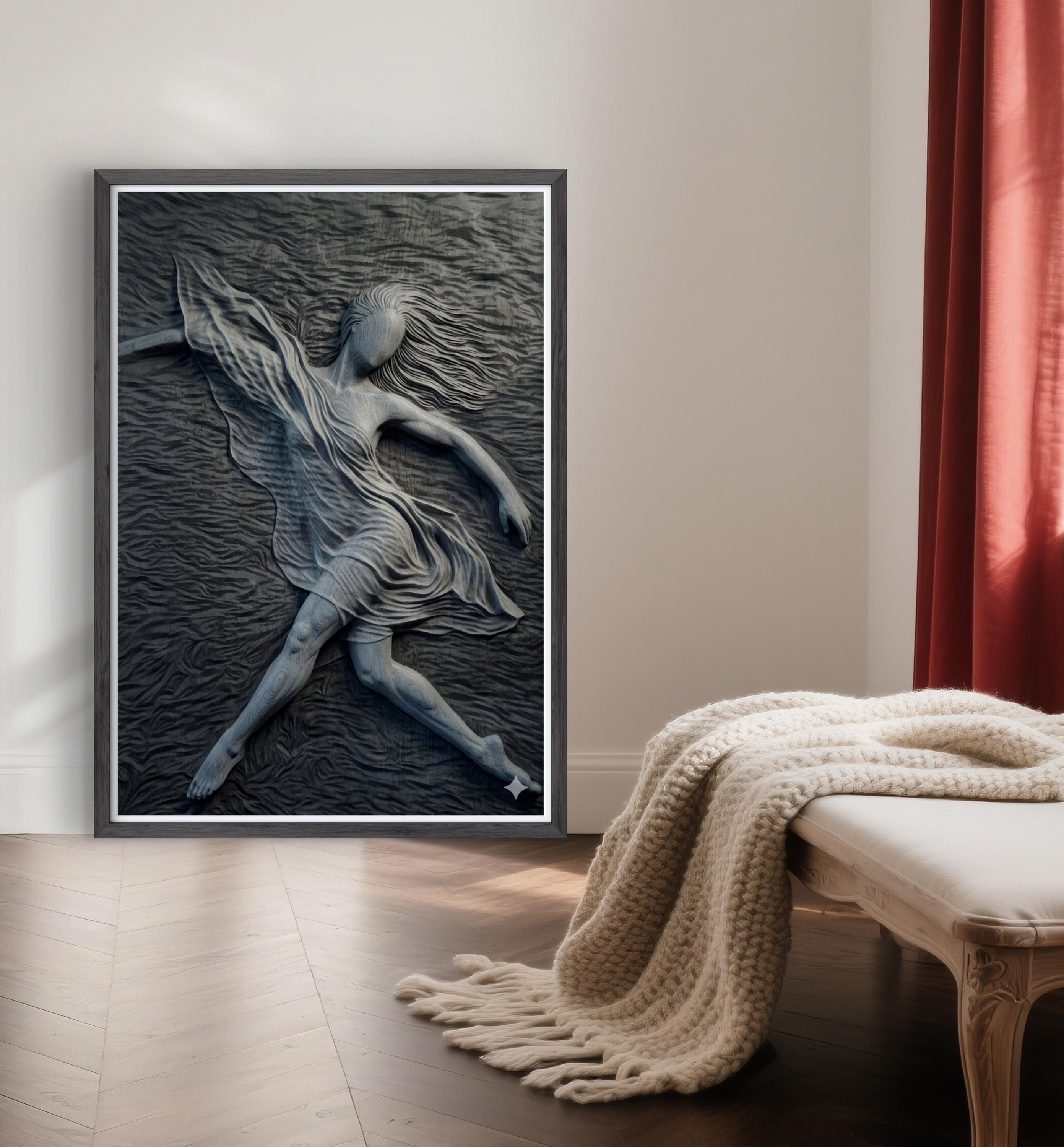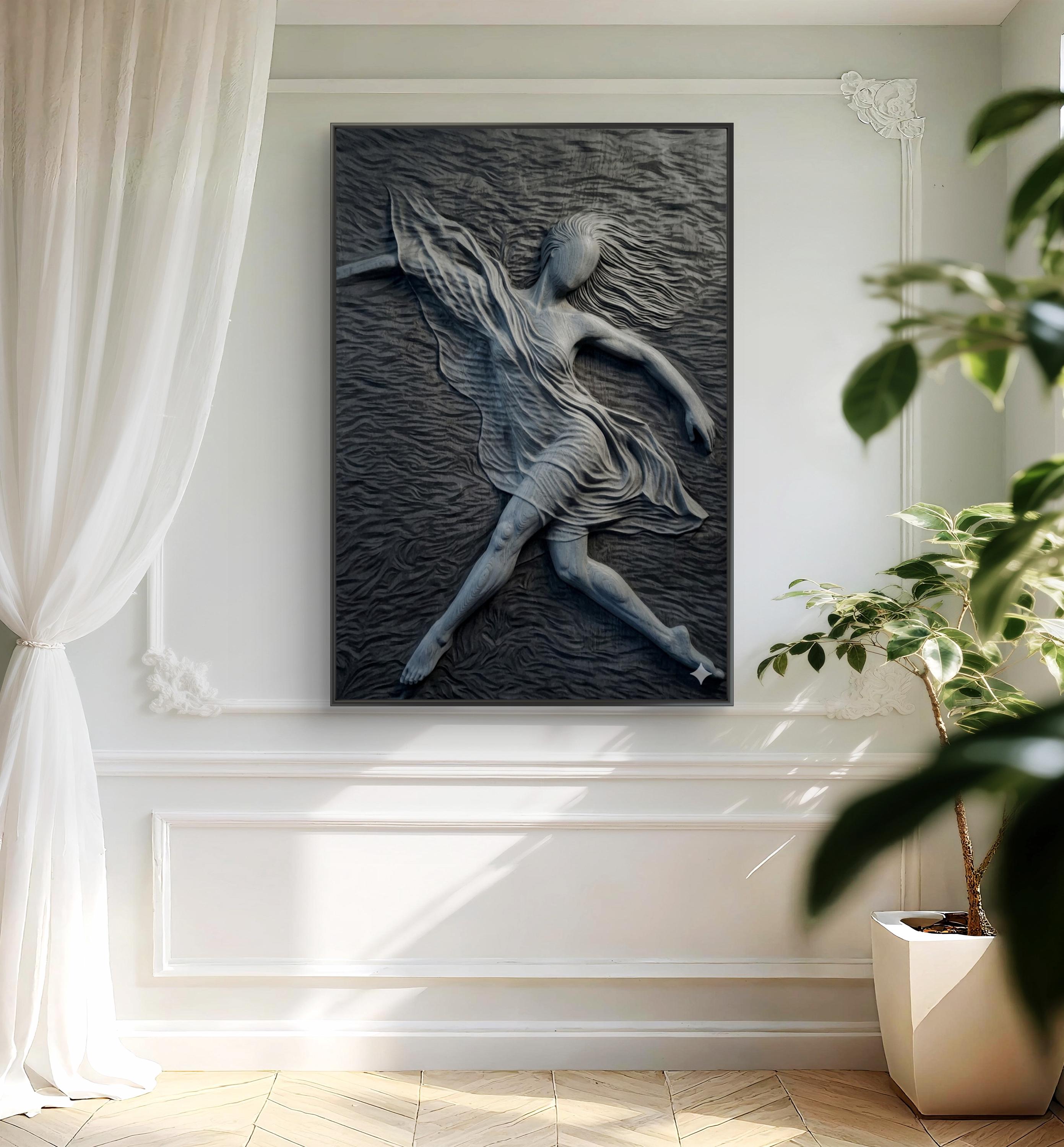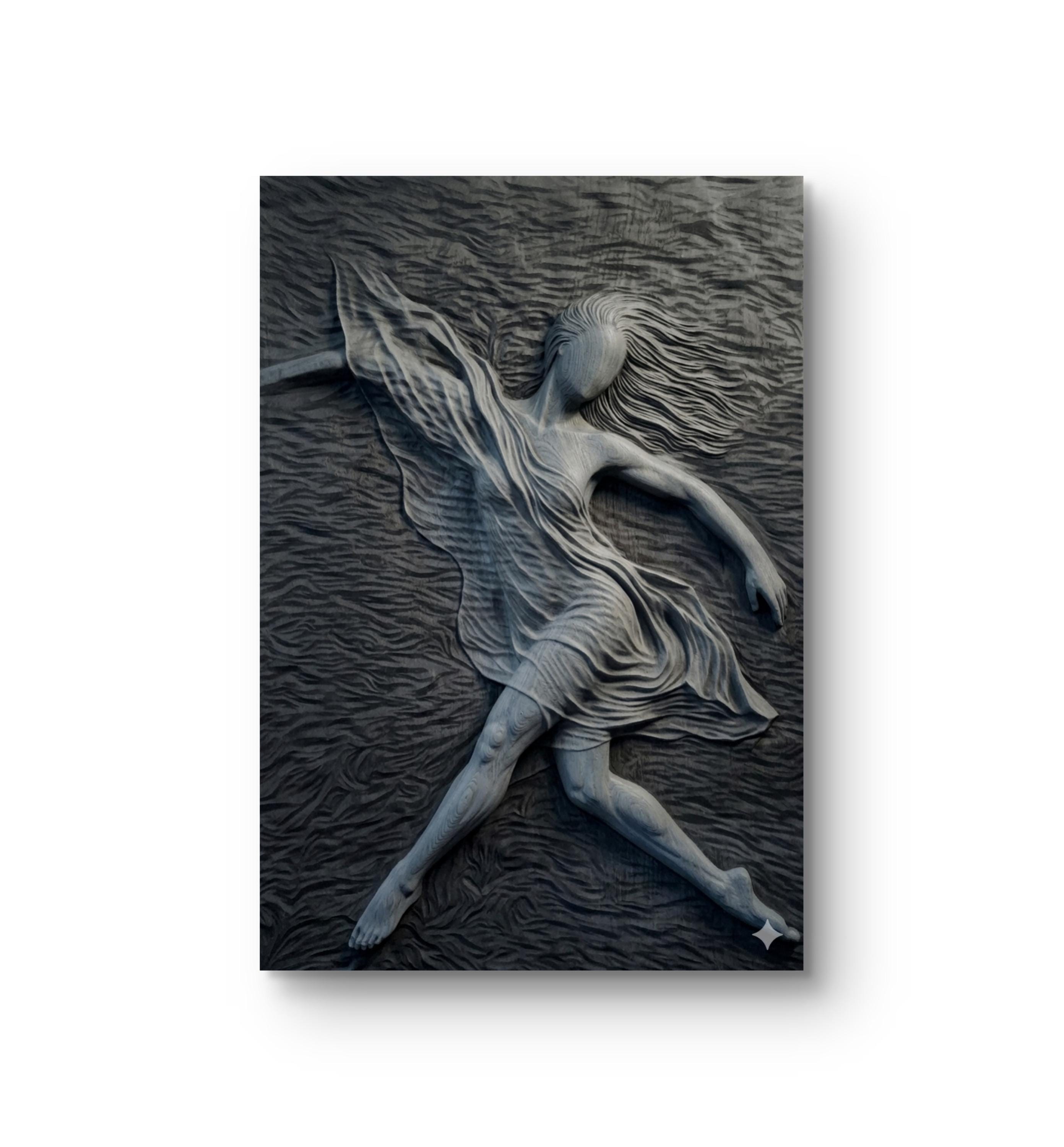 Sculpture the Fluidity of Motion transform your living space with this breathtaking bas-relief sculpture. This piece depicts a woman in a state of ethereal suspension, her form emerging from a sea of meticulously carved ripples. The soft, delicate textures of her flowing dress contrast beautifully with the rhythmic, wave-like background, creating a sense of dynamic calm.